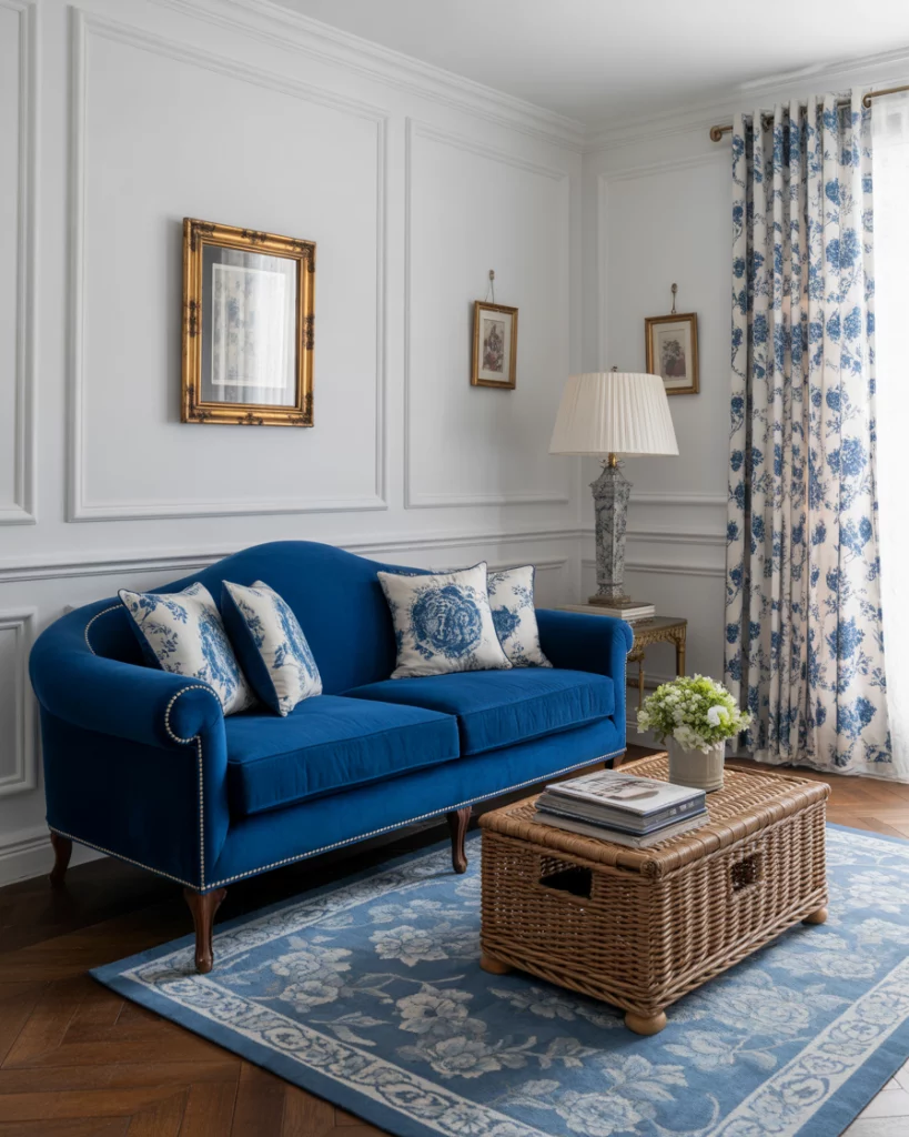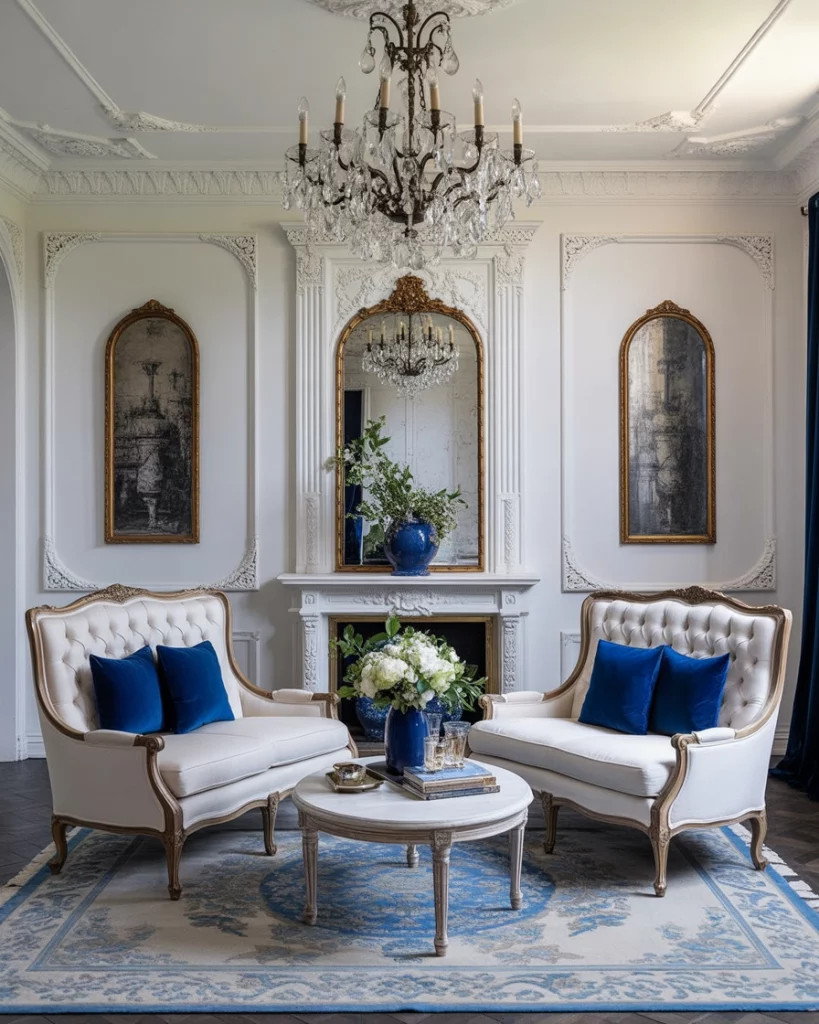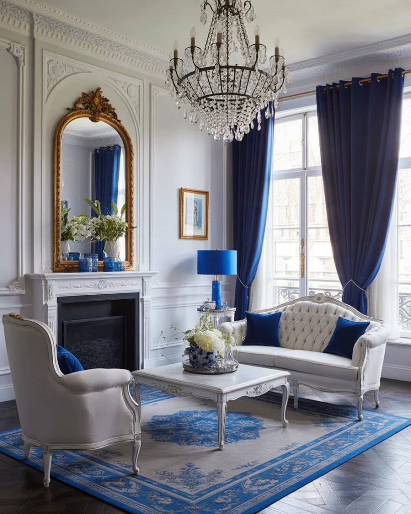 Bring timeless Parisian charm into your living room with royal blue accents, tufted white furniture, and gilded mirrors. Use ornate moldings and subtle floral colour palettes to evoke elegance and refinement. A traditional chandelier or vintage wall sconce adds a graceful touch. This style is perfect for those who love history, art, and subtle grandeur. Refer to French designer Jean-Louis Deniot’s work for high-end inspiration.