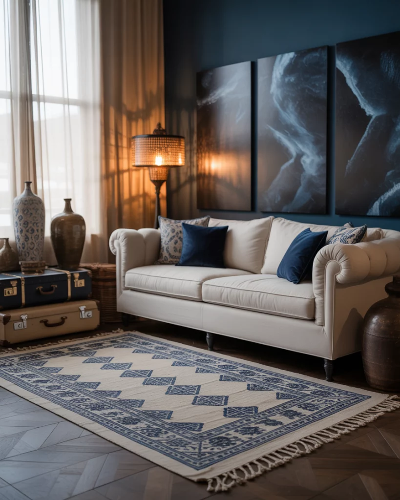 Combine bohemian-inspired flair with a blue and white theme using Moroccan tiles, indigo textiles, and handwoven accessories. This global mix embraces imperfection and soul. Incorporate dark navy wall art, textured cushions, and artisan-made ceramics for depth and warmth. Ideal for travelers and collectors, this room tells stories. See Anthropologie’s home collections for eclectic yet cohesive ideas.