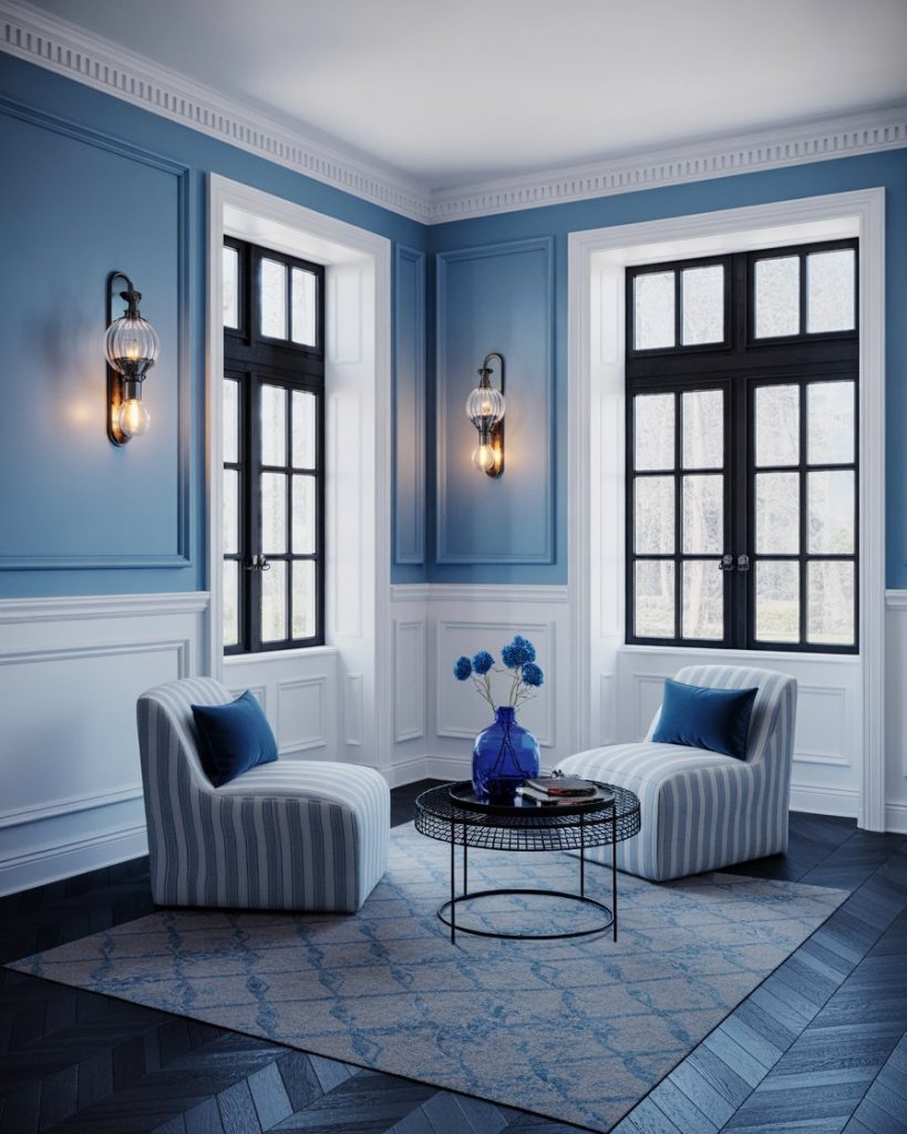 A traditional blue and white living room becomes more current with subtle black accents—think black window frames, lighting fixtures, or picture frames. Start with a sky blue base, white paneling, and layer in structure with black lines. It’s a smart way to modernize a timeless look. Interior designer Sarah Sherman Samuel often adds just enough black for balance.