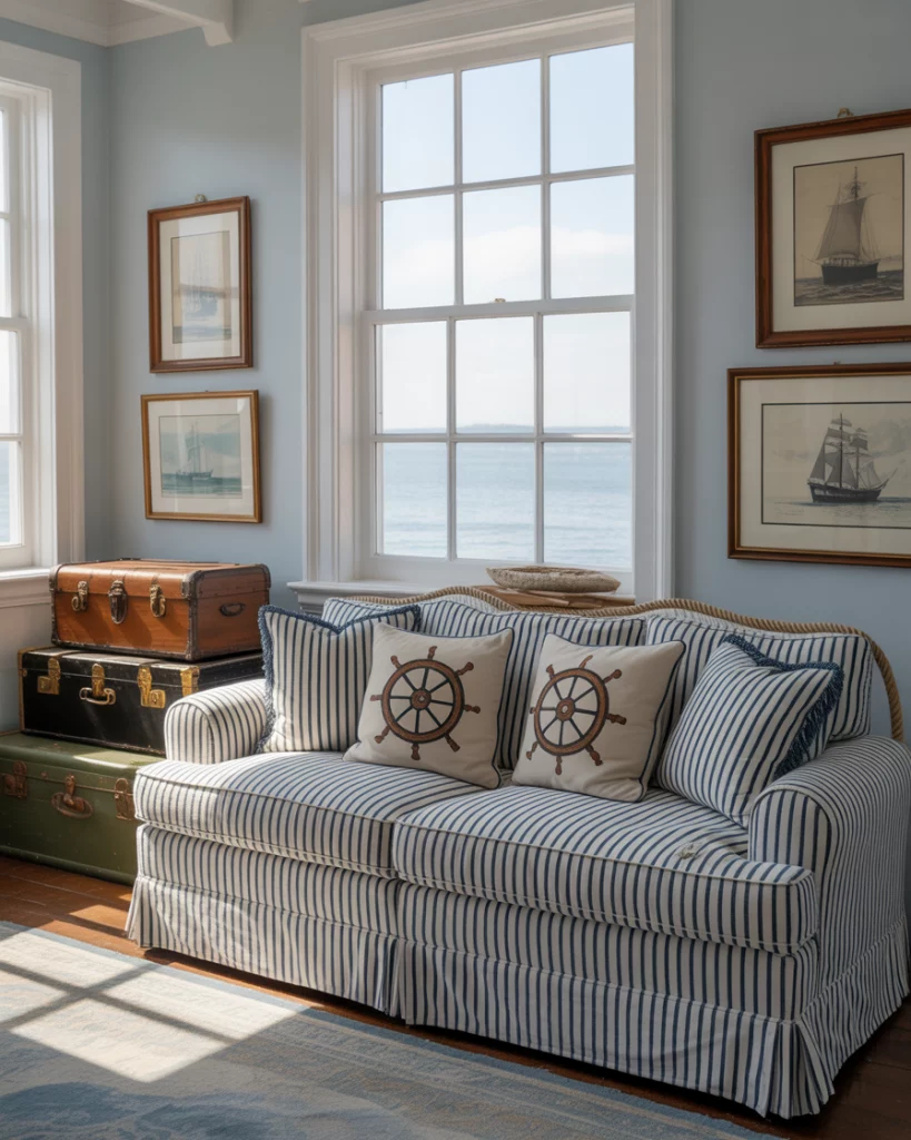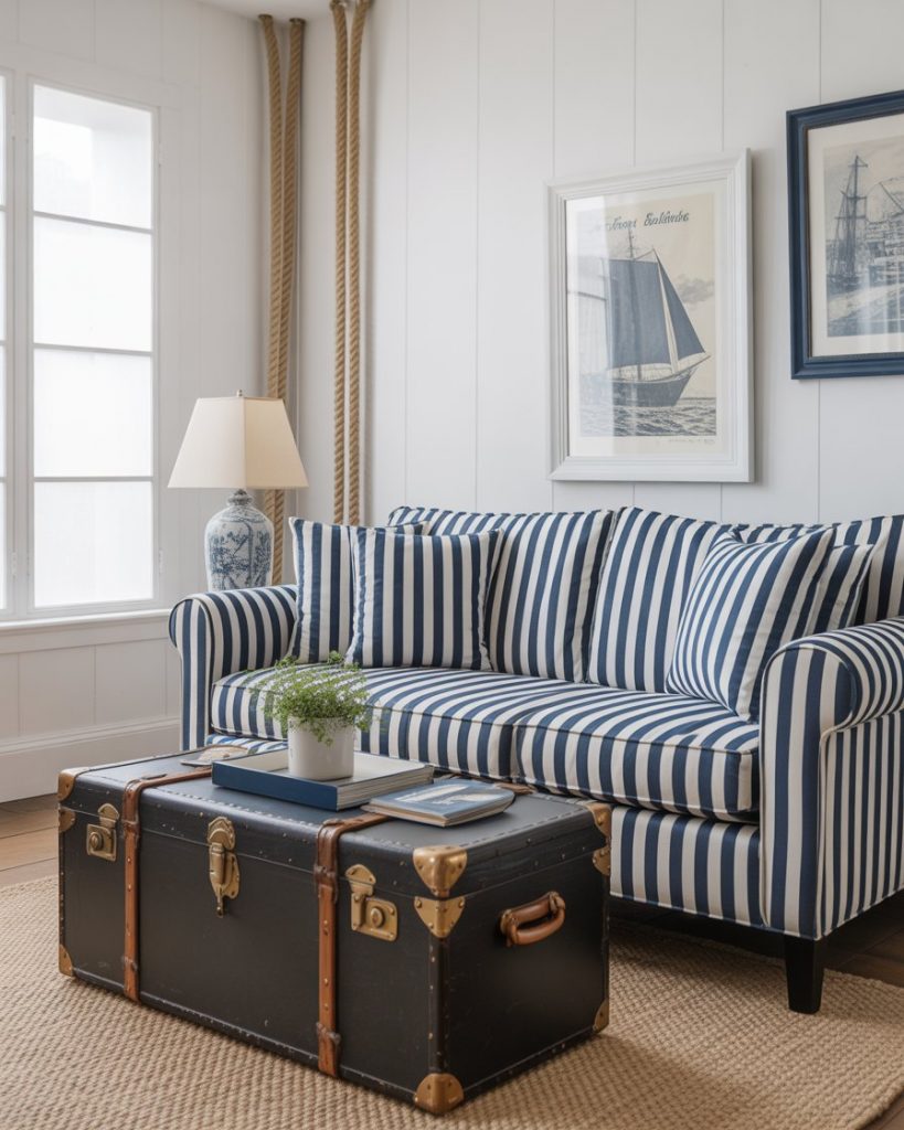 Incorporate nautical themes with navy and white stripes, boat-inspired décor, and rope details. It’s not just for beach homes—this look brings character to any space. Vintage trunks for coffee tables or antique sailing prints keep it grounded. Referencing the work of Sarah Richardson helps blend nostalgia with style.