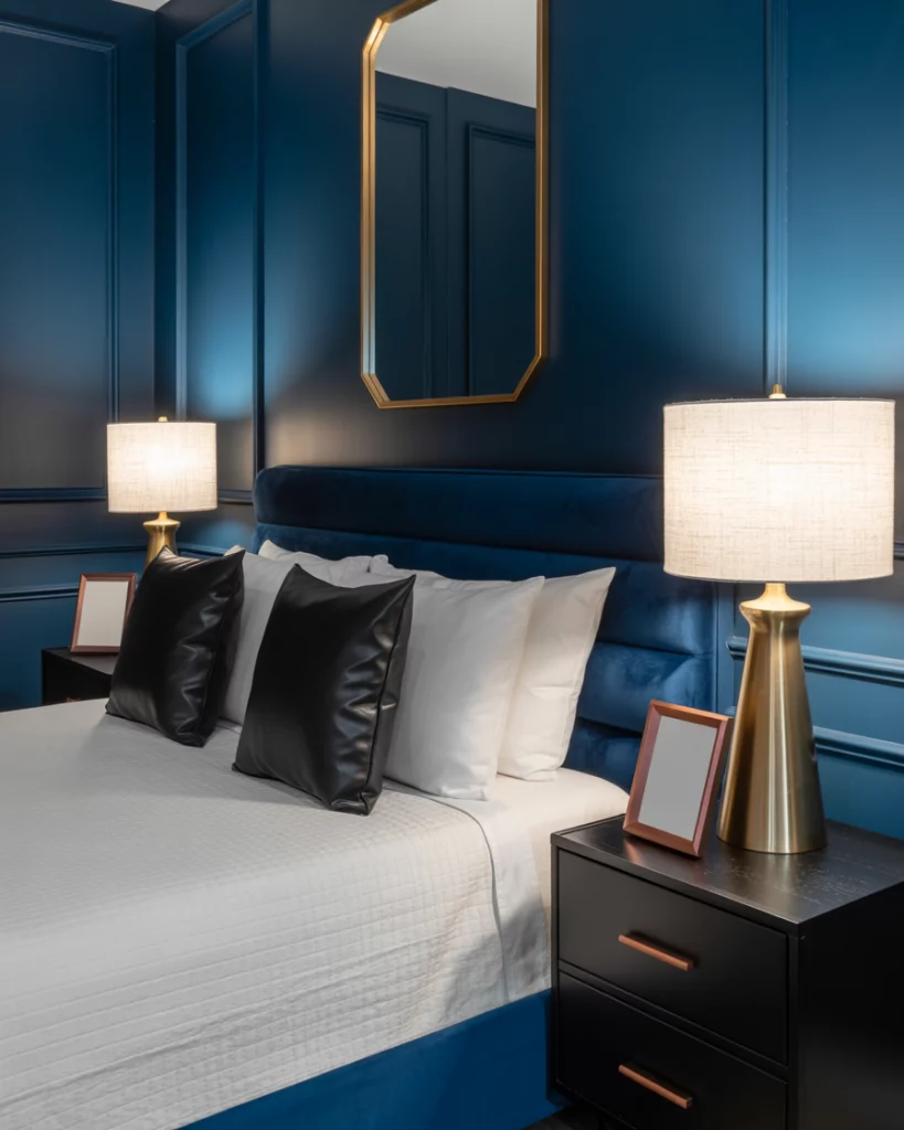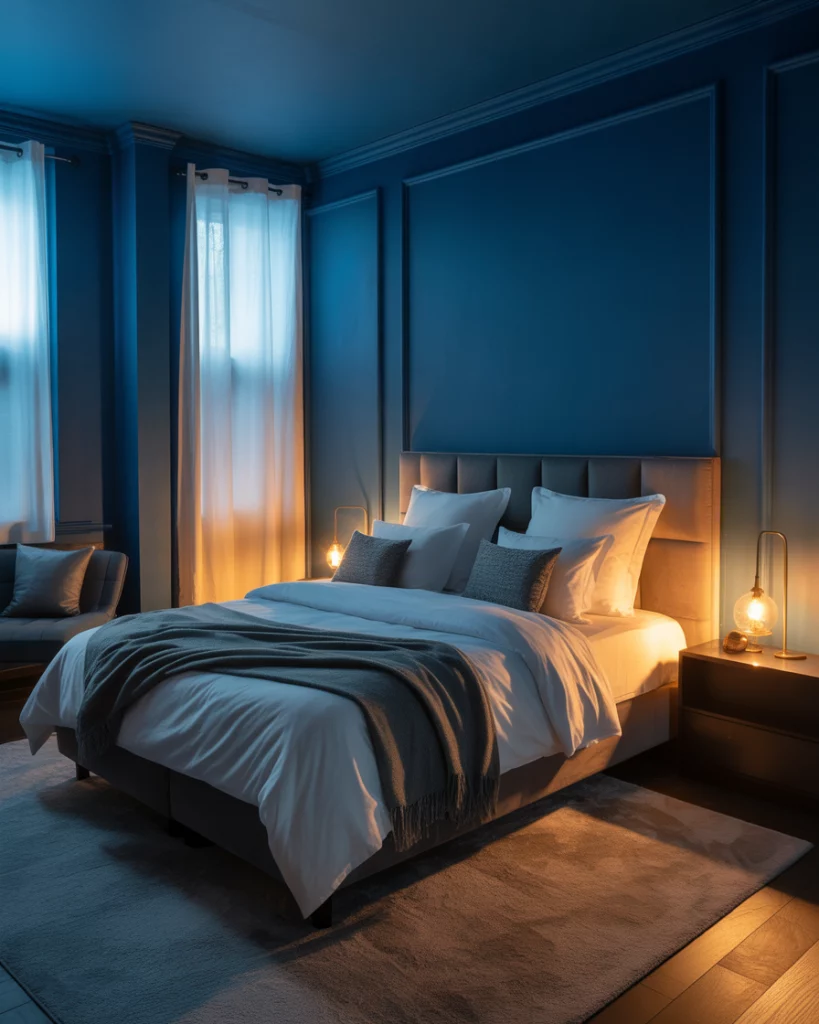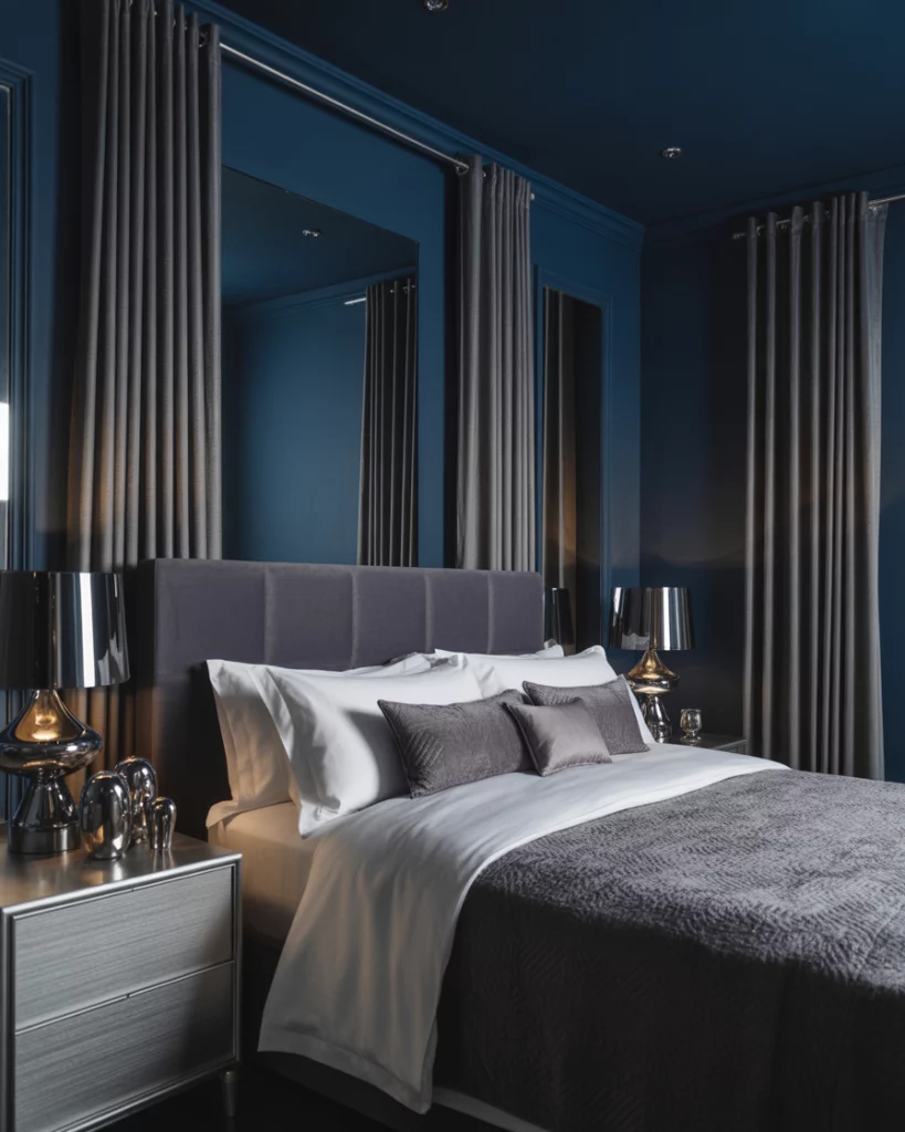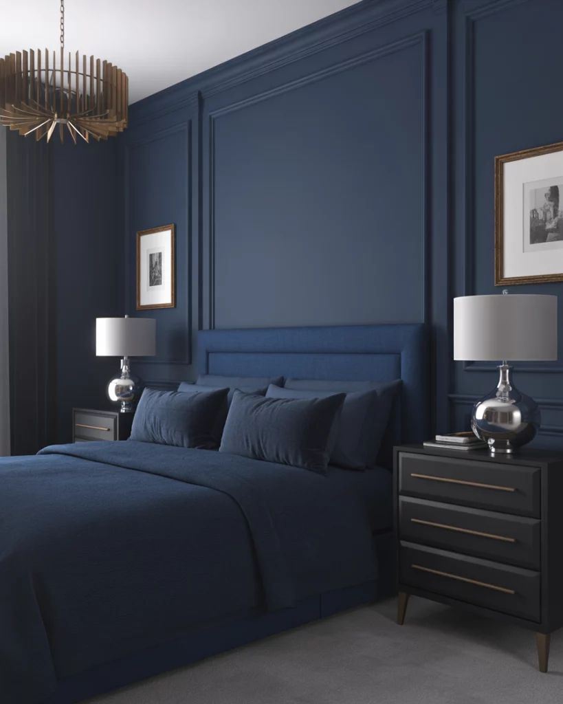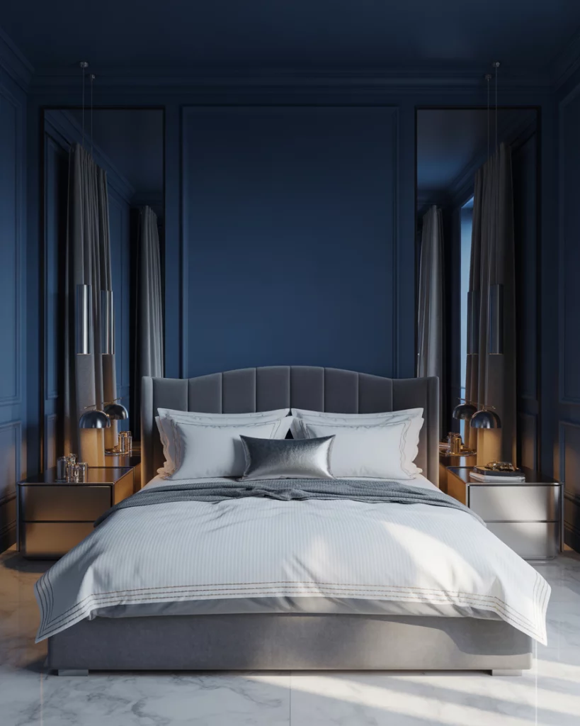 Go dramatic with dark navy combined with rich velvet headboards, metallic lights, and gray and silver to give it a sense of luxury. Perfect for couples or for those who want to transform the bedroom into a sophisticated retreat. The high saturation of navy conveys depth and coziness, especially in combination with white and bedding or wood tones to ground it.
