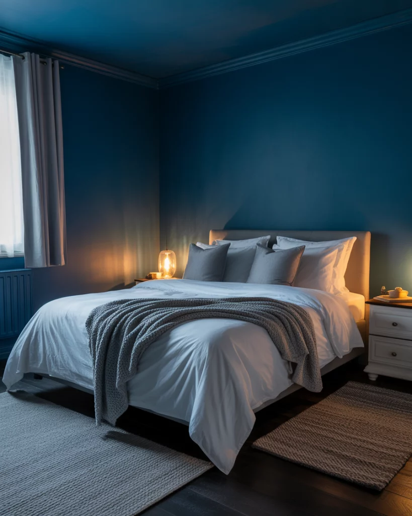 Embrace a dramatic dark backdrop by painting walls in midnight blue and layering lighter linens and throw pillows to balance the intensity. This concept works beautifully for couples or for adults seeking an intimate retreat. Accent pieces in white and cream, and subtle grey and taupe, soften the effect while maintaining sophistication. Ideal in larger spaces or rooms with ample light, this design grounds your sleep zone while letting accents breathe.