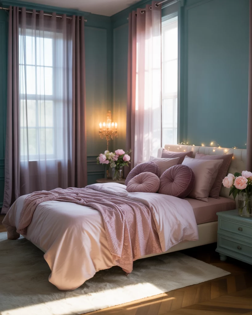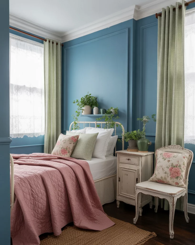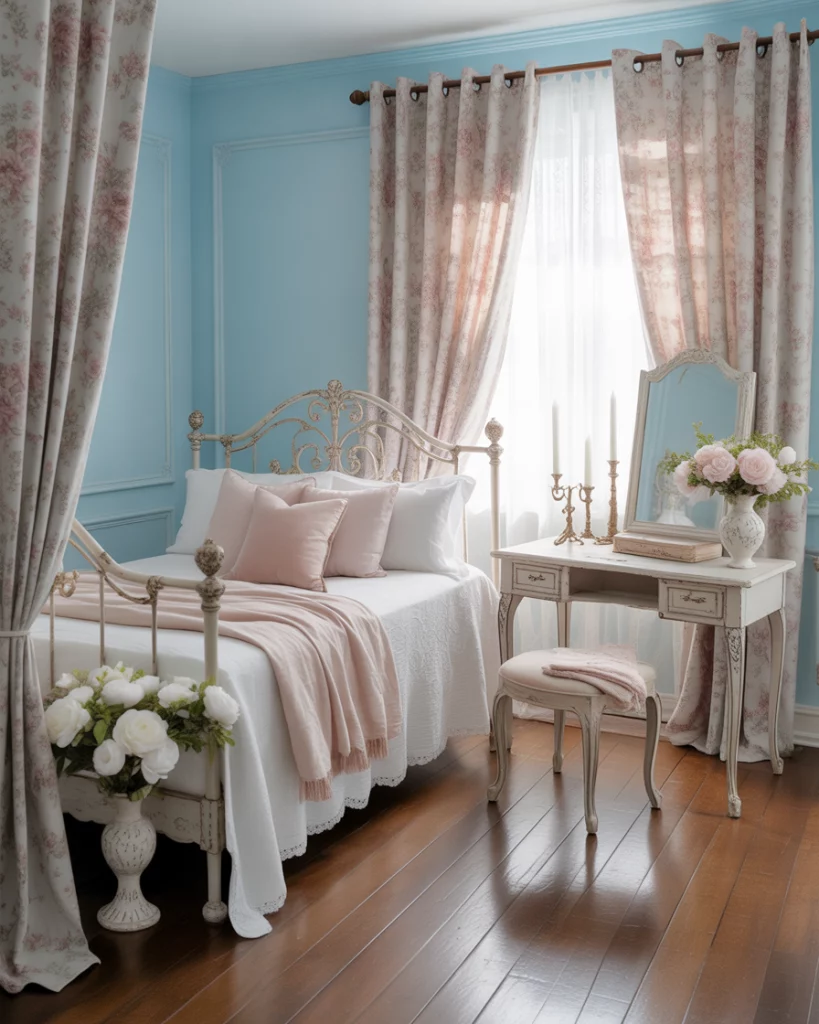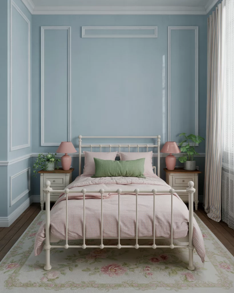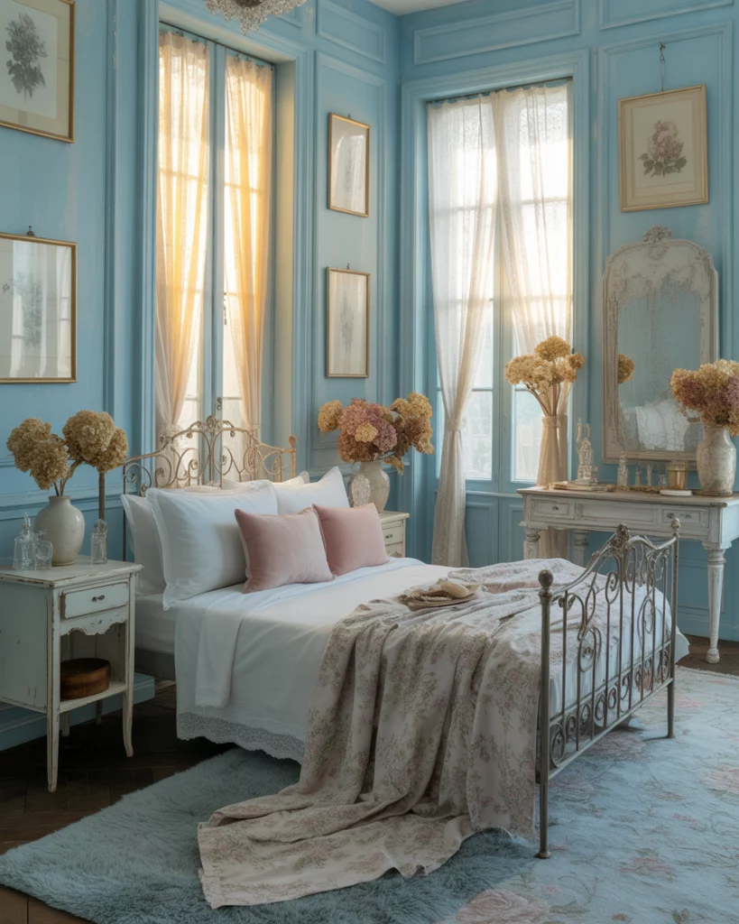 For small rooms, consider soft blue French walls (a chateau-inspired tint) paired with white wainscoting or moldings and touches of pink and/orgreen in florals or fabrics. This aesthetic nod to classic European charm works for women, for couples, or for kids who love romantic vintage flair. Keep furnishings minimal, use mirrors to enlarge space, and incorporate lace or linen for softness.