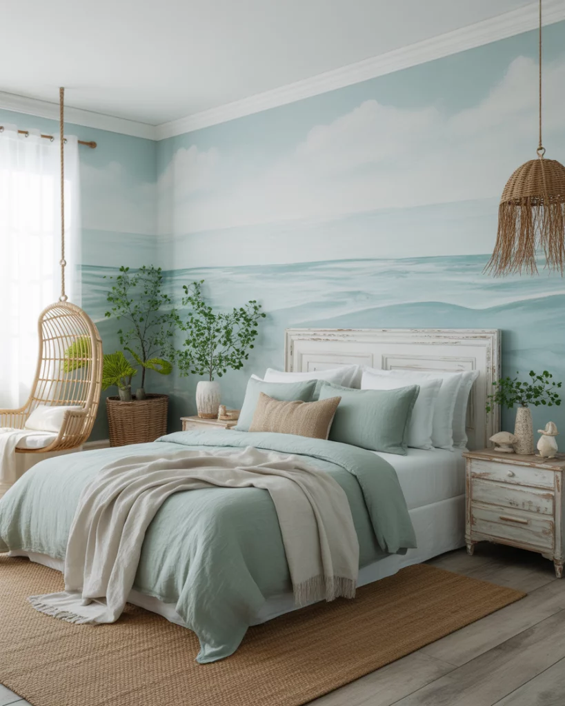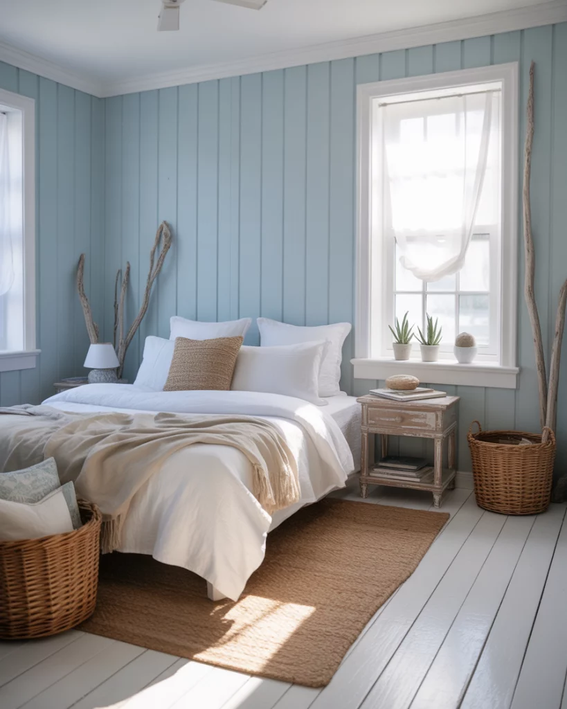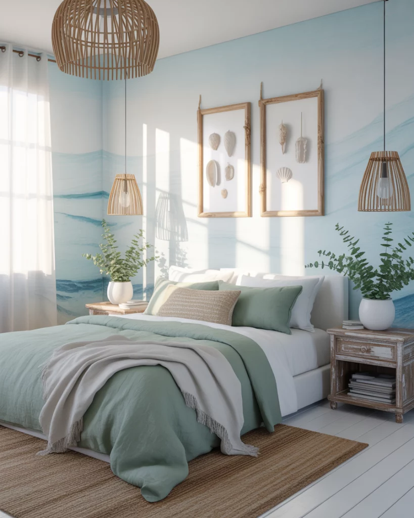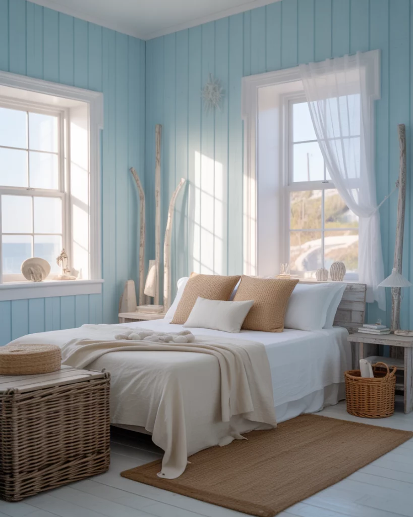 Channel the peaceful vibe of the sea by blending light blue walls with green and sea-glass accents. Think rattan textures, soft linen bedding, and driftwood details for a cozy coastal escape. Perfect for adults or for couples who crave serenity after long days. Incorporate white and trim and sand beige rugs to evoke the shoreline—subtle, timeless, and always calming.