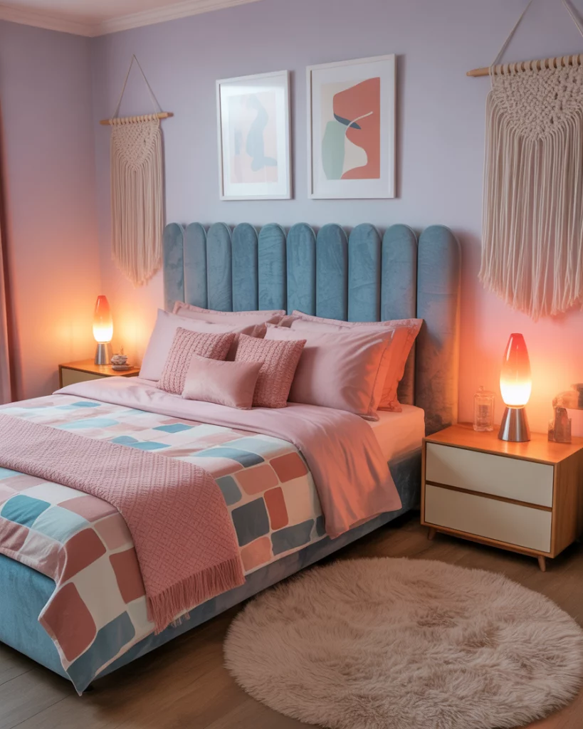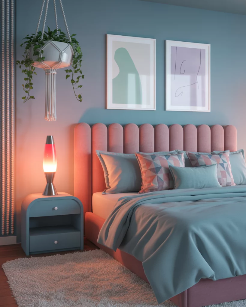 Bring a fun 1970s look to life by combining blue shades with soft shades of pink and coral accents. The combination feels youthful and ideal for teens, for females, or for small rooms where you need to introduce joy and vibrance. Incorporate round mirrors, funky lights, and pastel prints to make it even more vintage yet contemporary. A pastel blue background adds warmth without conflicting.