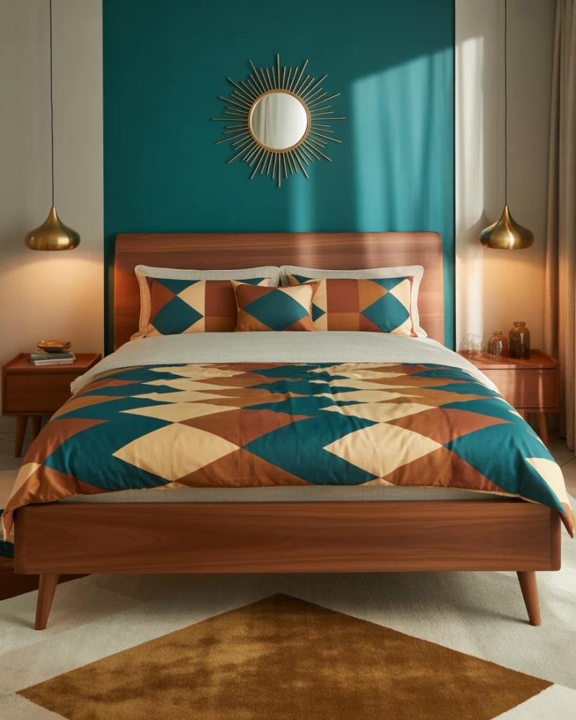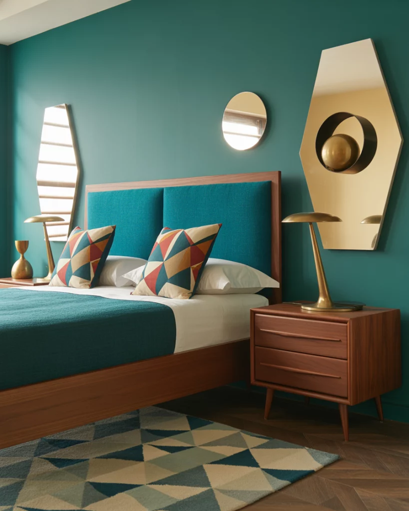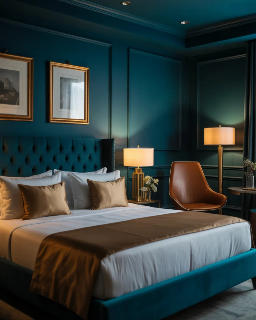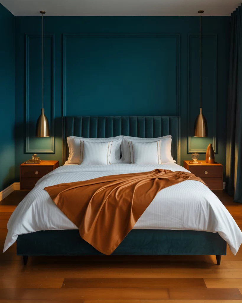 A deep dark teal hue brings richness and refinement to any bedroom, especially when paired with brown and wood tones and golden metal accents. Perfect for adults or for couples who enjoy bold sophistication with warmth. Add velvet cushions, patterned rugs, and warm lighting for an inviting touch that still feels elegant and modern.