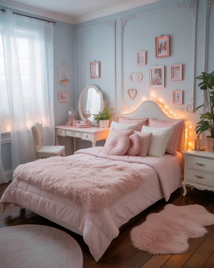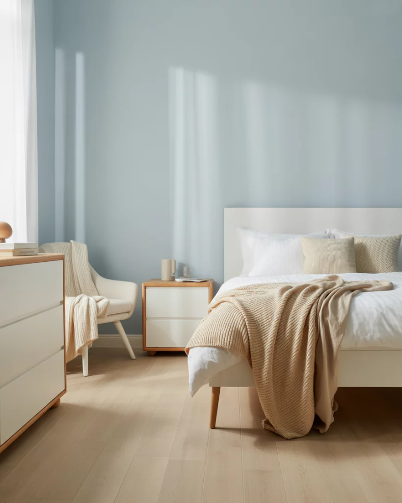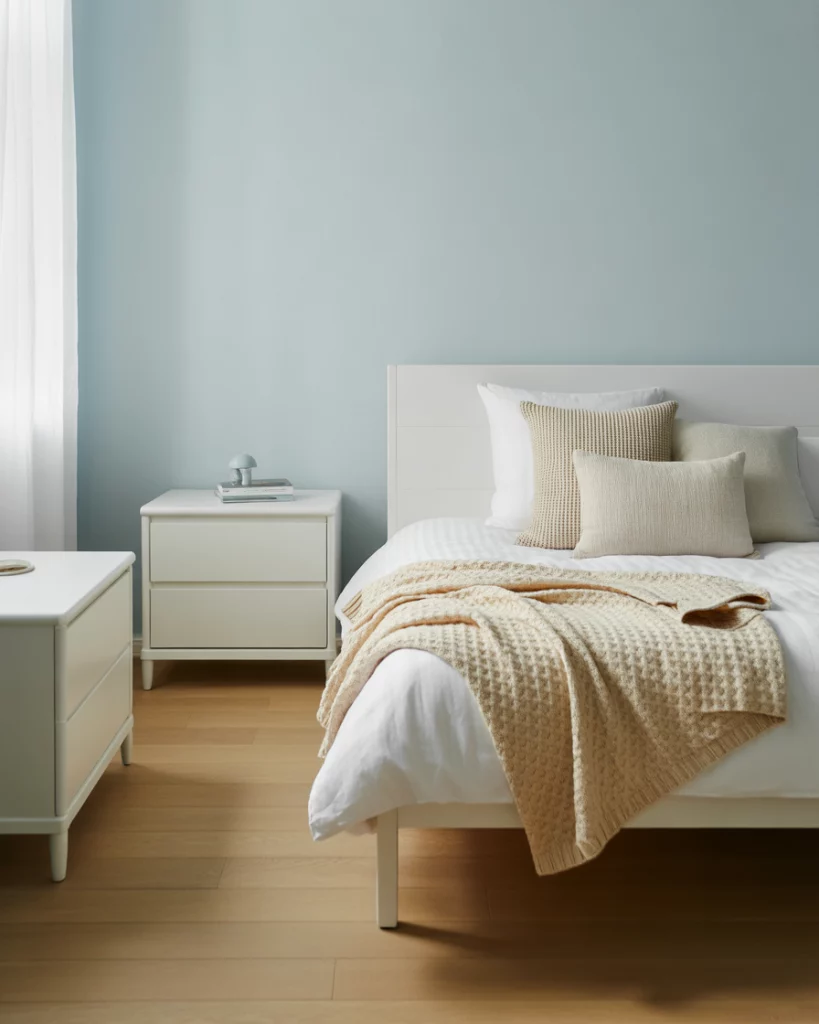 Delicate pastel blue walls create a soothing yet youthful vibe, ideal for teens, for a girl, or for women who love a romantic touch. Pair with blush pink bedding, soft lighting, and white furniture to enhance the dreamy mood. Small metallic details—like a mirror or lamp—keep it feeling polished rather than childish.