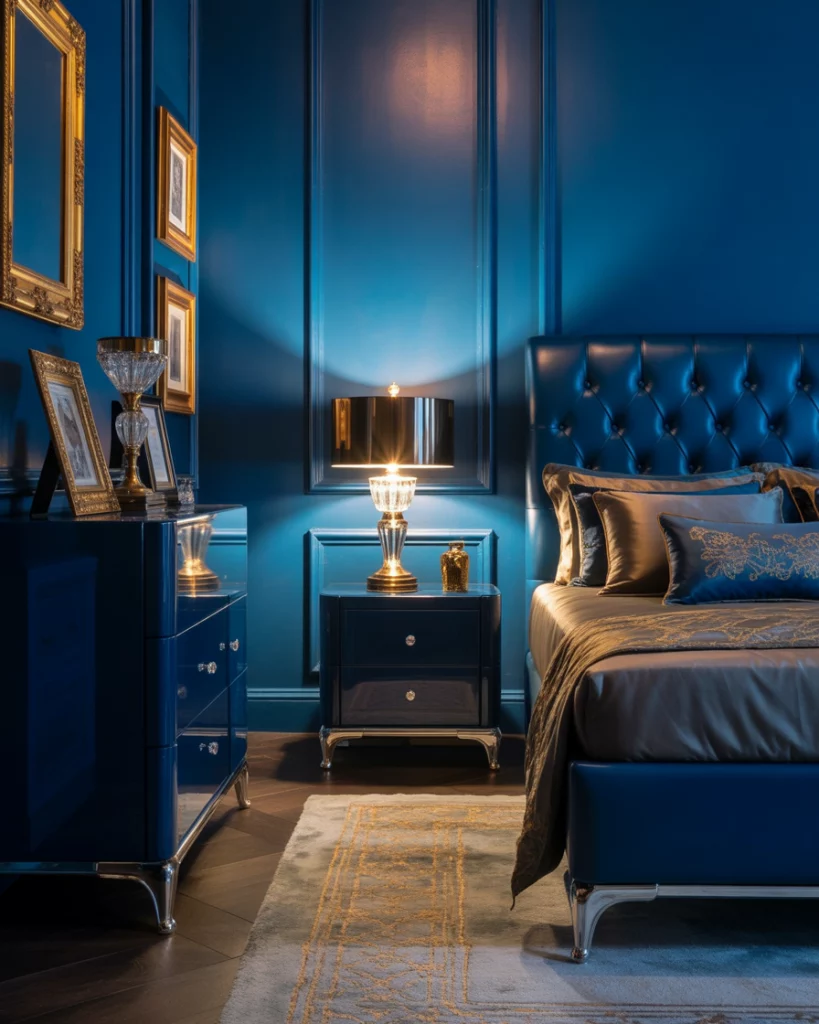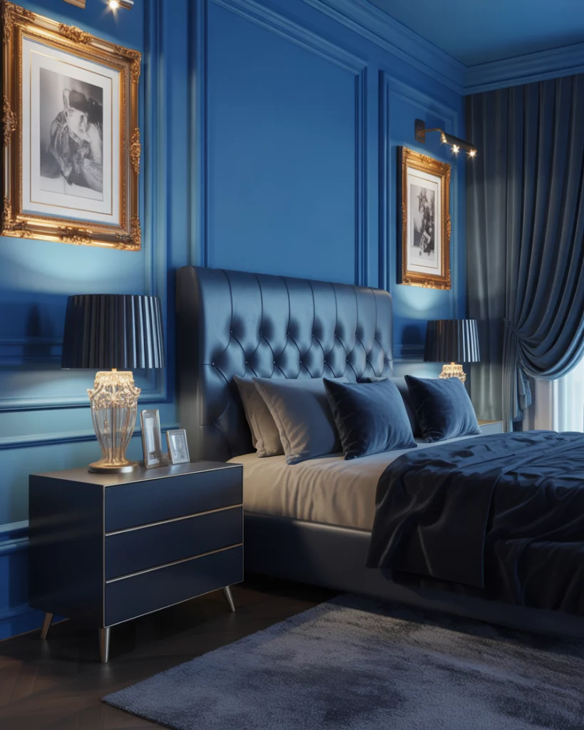 Celebrate royal luxury with a royal blue wall and offset with gold frames, chandeliers, and dark velvet drapes. This combination feels theatrical for couples or women who appreciate statement luxury. Add black furniture or gray rugs to ground the luxury. The end result is aristocratic and accessible—ideal for master suites or boutique homes.