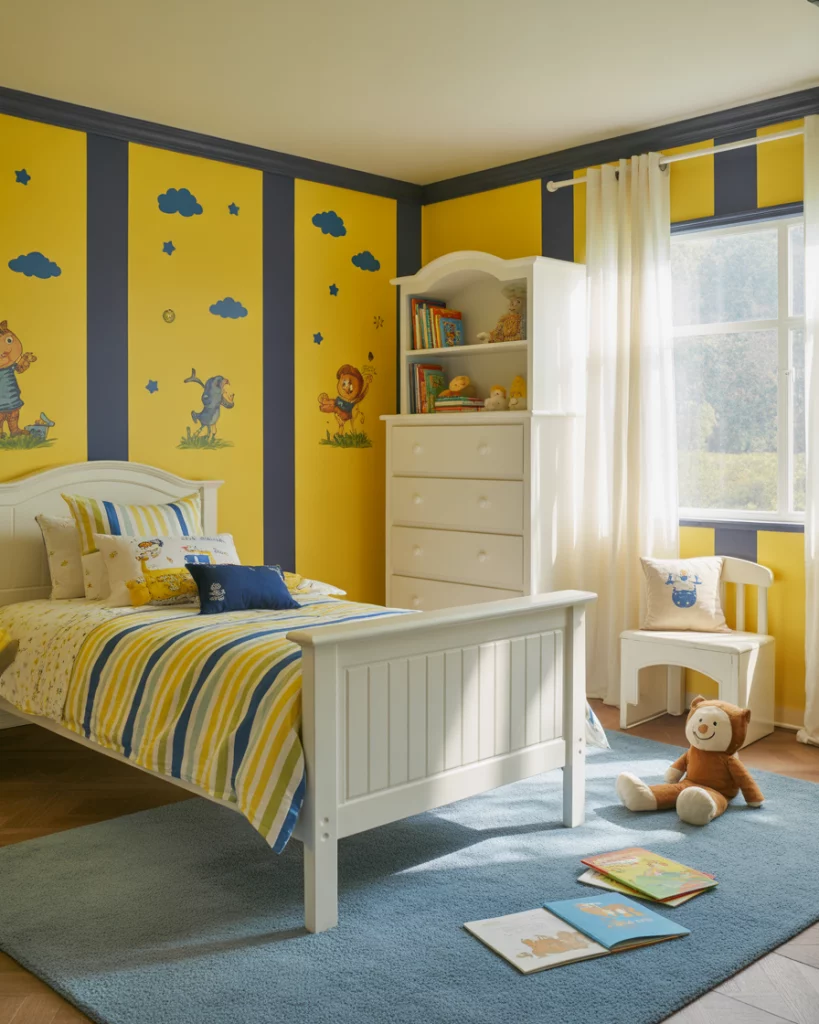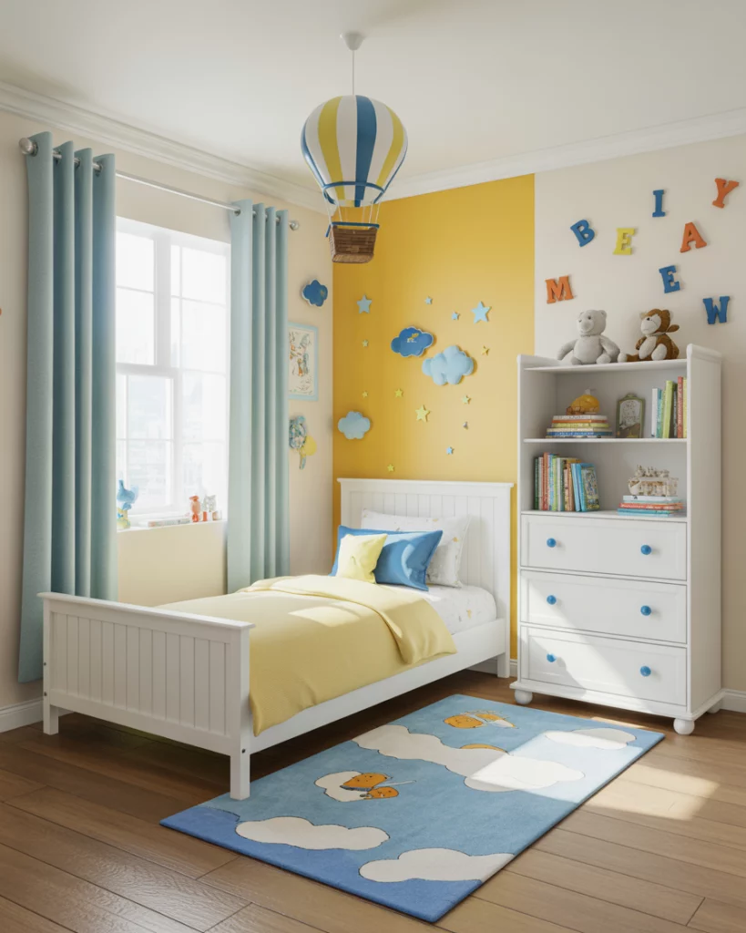 Select a muted baby or pale blue to cultivate a gentle, luminous space, and elevate it with touches of yellow for warmth and gray for grounding. This palette is versatile for kids, for couples, for women, or for adults who want a cheerful tone rather than intense drama. Keep fabrics light and curtains sheer, and allow daylight to dominate.