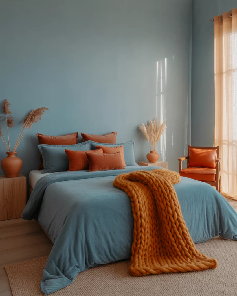 Ideal for those with a love of contrast: combine dusty blue walls with warm oranges and earthy terra cotta accents. This combination feels both stimulating and earthed—an excellent combination suitable for adults, teenagers, or couples. Wooden furniture, linen bedding, and textured fabrics complete the scheme. These new finishes on walls and ceilings make it possible to achieve an elegant and comfortable atmosphere. Use matte finishes to have an elegant and comfortable atmosphere.