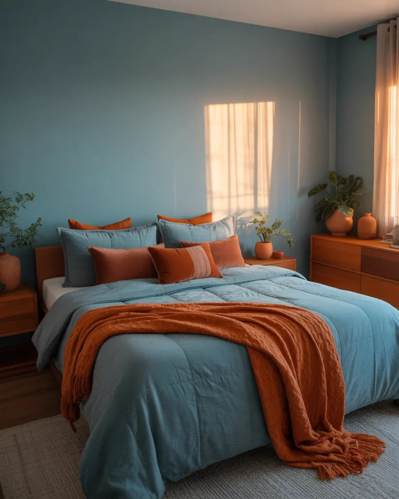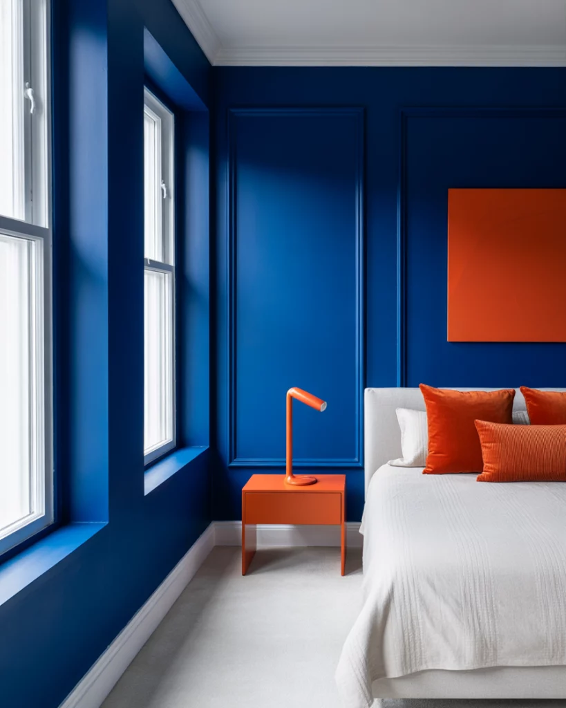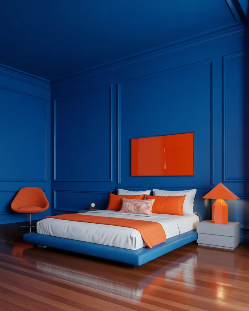 Go vibrant: a royal blue backdrop paired with crisp white walls or trim and a daring dash of orange and accents in art, pillows, or a chair. This combo delivers energy without chaos. It’s bold for teens or for a modern adult who wants a statement room. Use neutral solid furniture and balance with grey and other elements to temper the contrast.