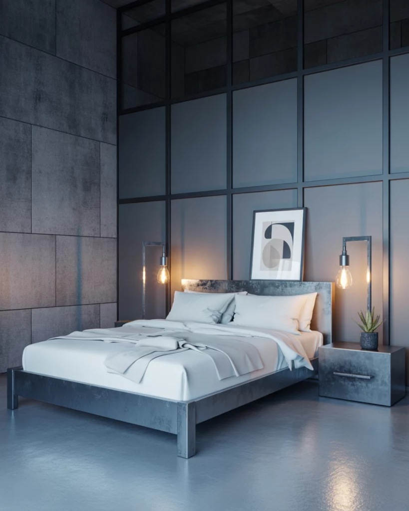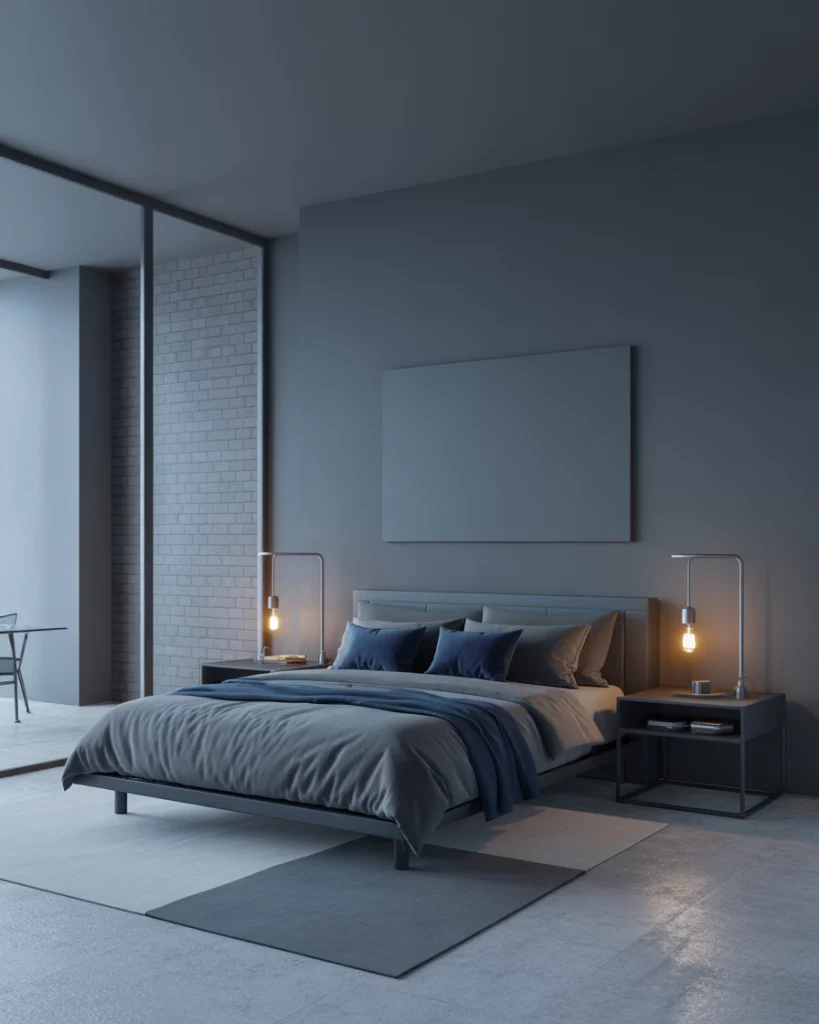 Combine gray and blue hues to create an industrial urban edge. Consider exposed brick, metal lamps, and minimal furniture. Great for men, for boys, or for couples who admire contemporary city flair. A dark or midnight blue background on the wall behind the bed adds drama, while white and linens make it balanced. A single red and/or rust accent adds energy.