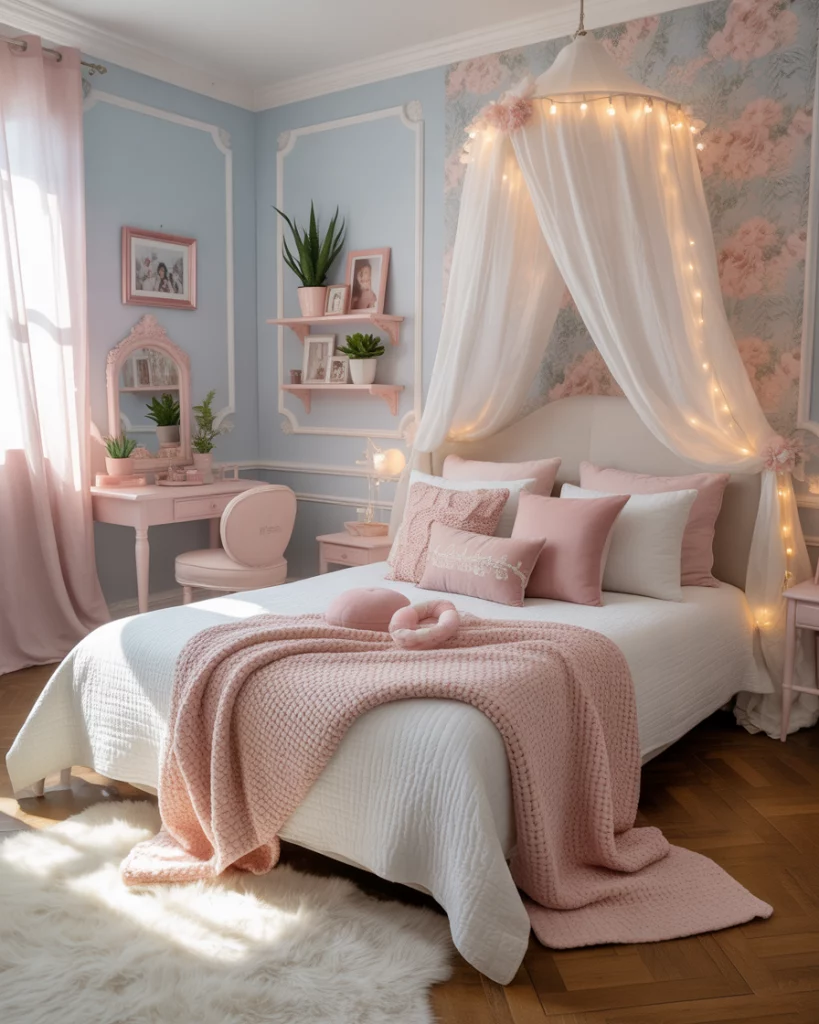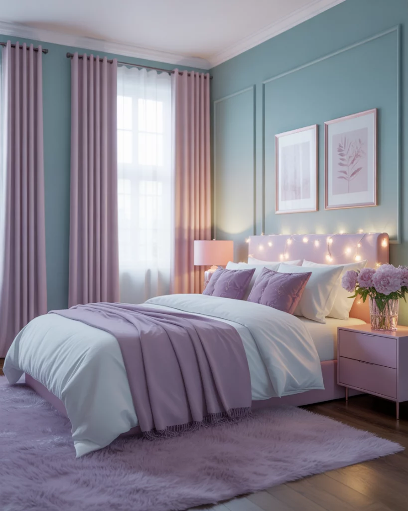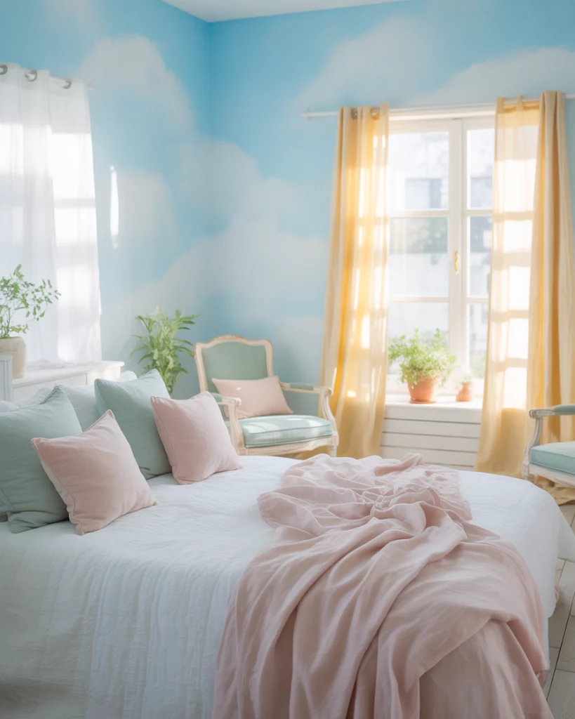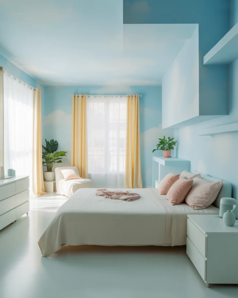 Opt for a light sky blue as the dominant hue to evoke open skies inside your room. Combine it with pastel pinks, pale yellows, or mint greens (green) to inject refreshing playfulness. This style is especially charming for kids, for teens, and for a girl version, but also sweet for women favoring gentle color palettes. Keep furniture white or natural wood to preserve an airy, calm aesthetic.