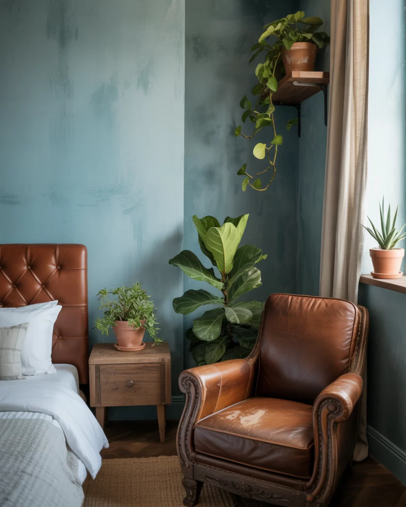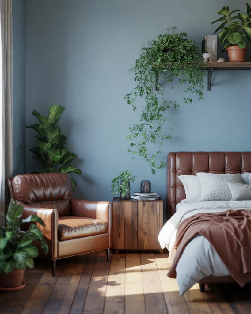 A dusty blue tunefully pairs with brown and leather textures, plus hints of green and botanicals, to create grounded sophistication. This palette works beautifully for adults, for couples, or for small rooms where you want depth without overwhelm. Use warm wood floors, woven rugs, and soft throws for cozy harmony. Accent with muted ochre or beige to enhance the welcoming feel.