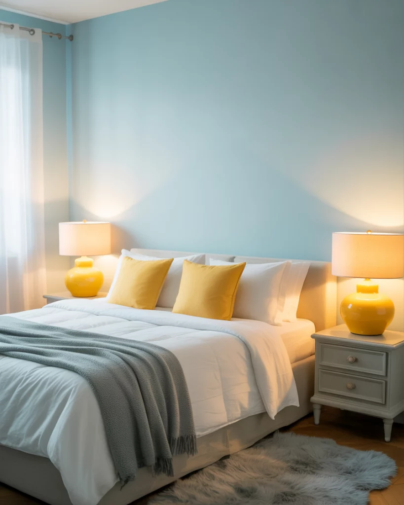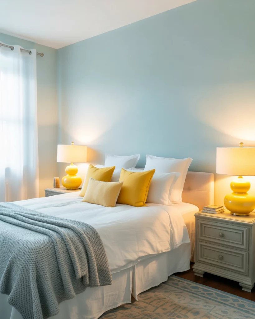 7. Soft Pastel Blue with Yellow and Gray Pairing