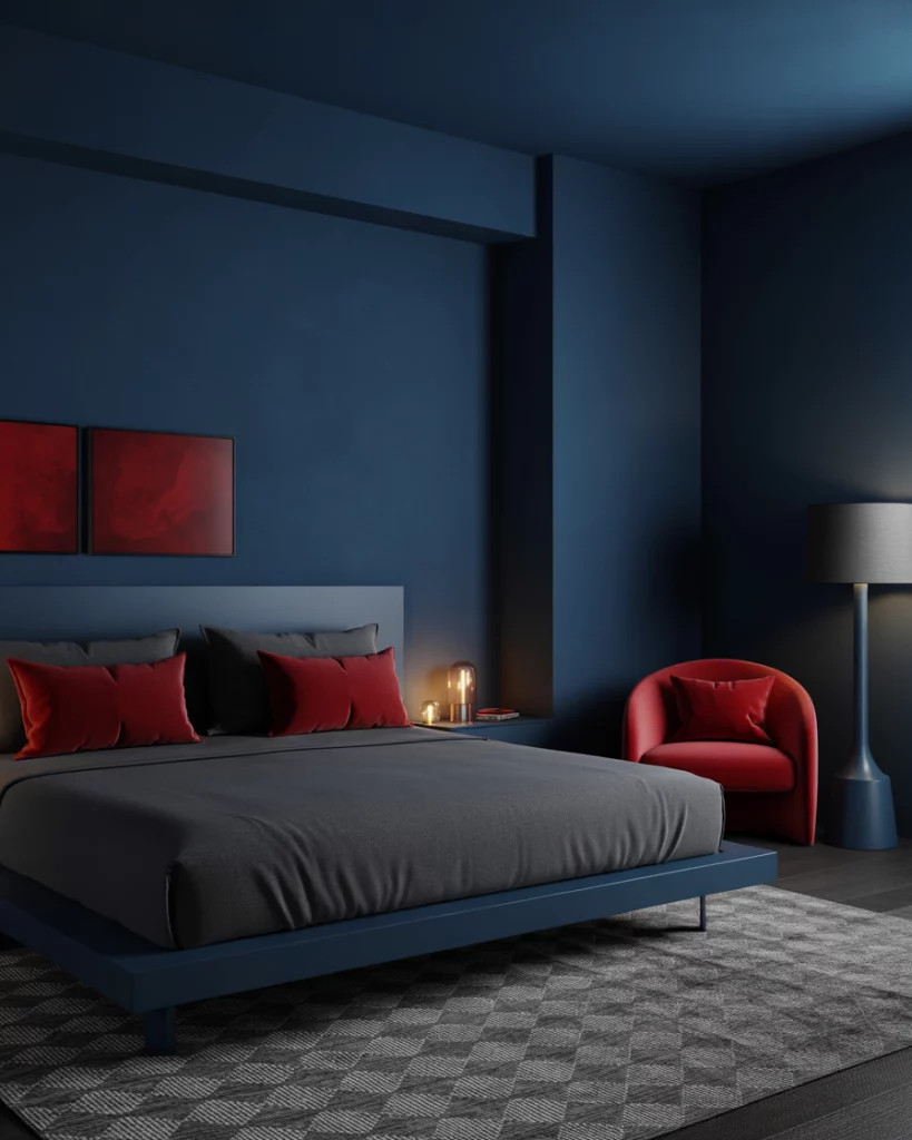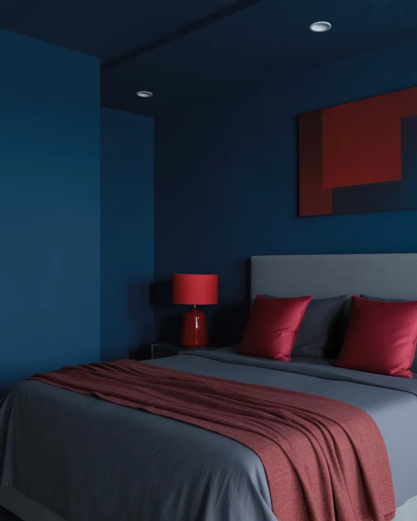 Dark navy or midnight blue walls can stunningly absorb light and make vibrantly accented shades like red and/orwarm gray pop. This bold statement style suits couples or adults wanting dramatic flair. Use the red sparingly—throw pillows, artwork, or a chair—to avoid overwhelming. Surround with neutral elements in stone, concrete, or matte metals for balance.