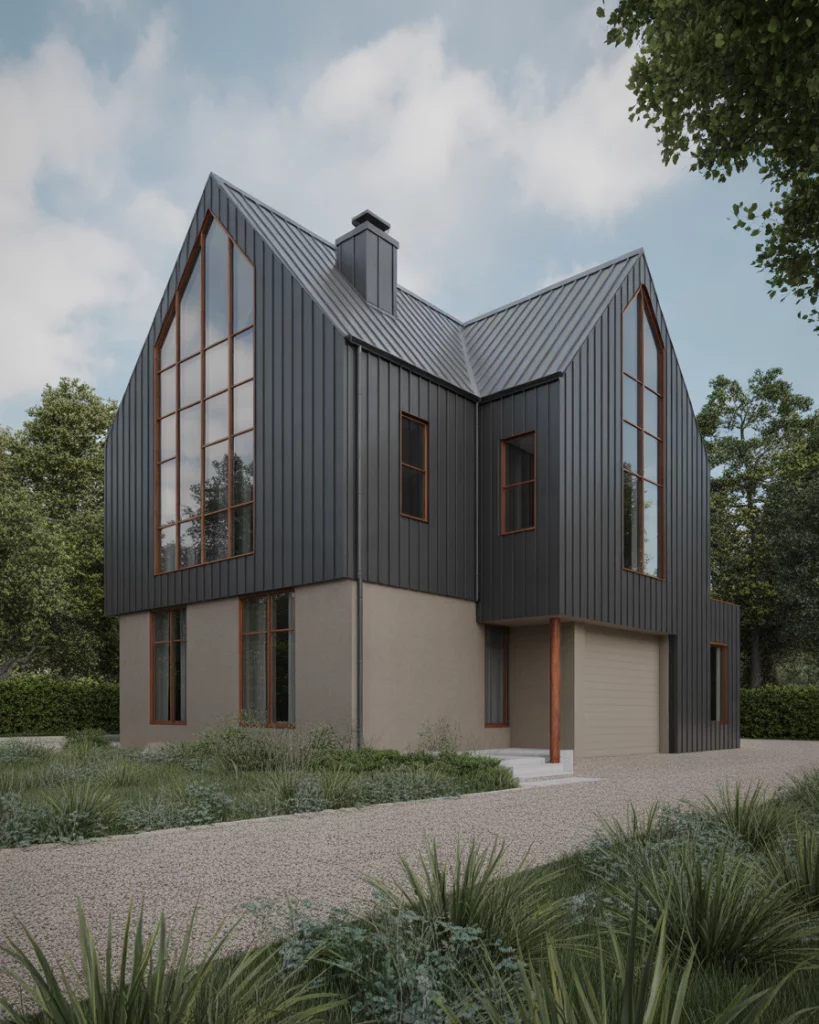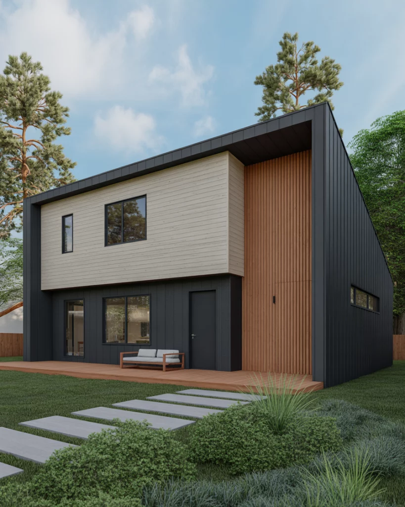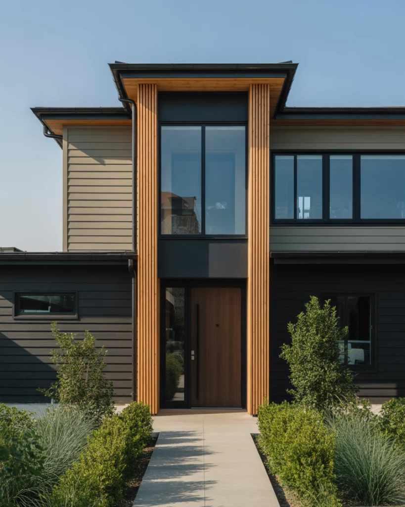 A combination of black house facade and light tan details and wood accents modern finishes is among the most popular trends nowadays. This style has a perfect balance of the coziness of the earth with the bold minimalism. Light tan siding provides emphasis on the architectural lines, and natural wood decoration, e.g. soffits or window frames, creates the visual softness. This mix works in suburban areas where property owners desire a style that is friendly and eye-catching.