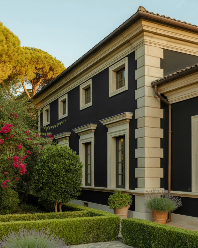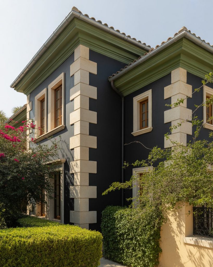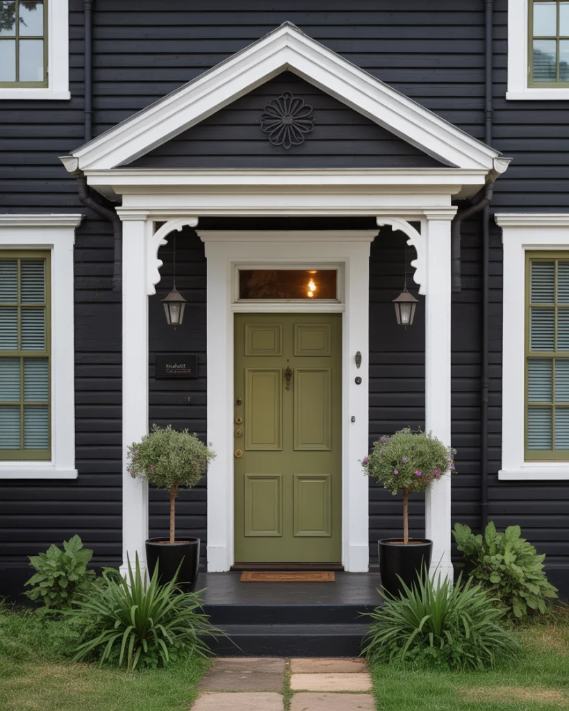 To be really different, combine a black front with pale limestone and faded olive green molding. It is such a beautiful palette which is natural and classic and which suits particularly well with transitional or Mediterranean-inspired houses. Big areas can be black and olive green is a light brush of a touch of earth.