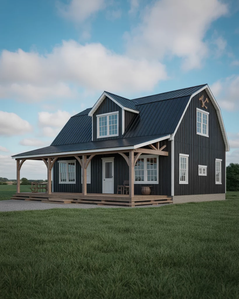 13. Black Barn-Style Home with White Trim and Wood Accents Farmhouse