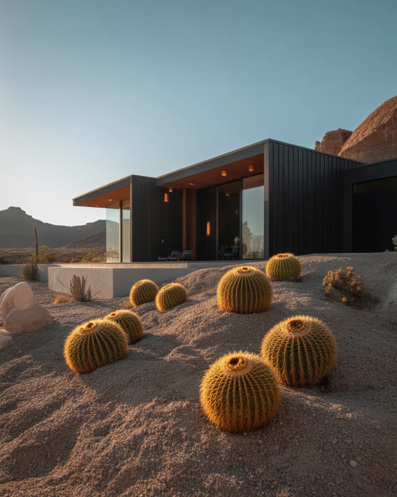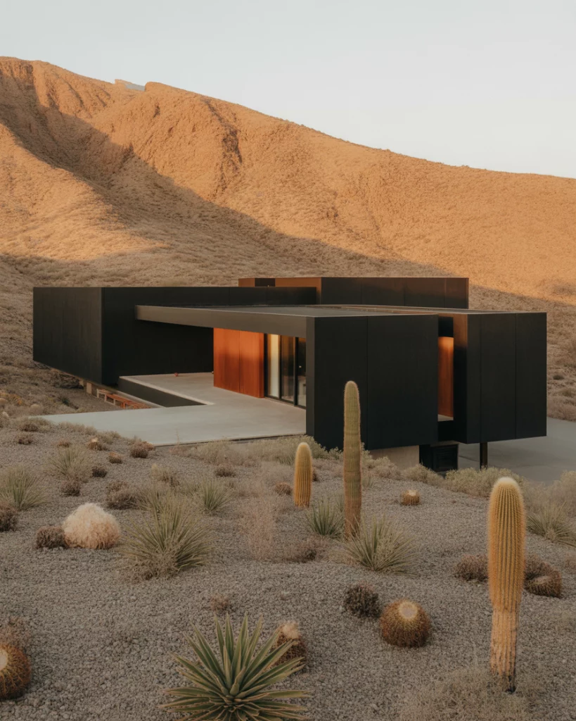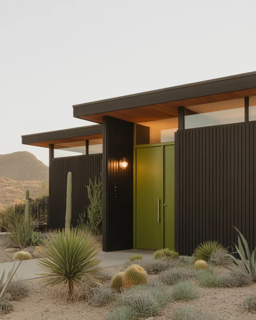 The use of black as a visual anchor to heat absorbing visual anchor benefits the modern homes in arid climates. This pattern paired with indigenous stone walks, cactus-inspired landscaping, and copper illumination is futuristic and at the same time earthy. Reflect a midcentury modern vibe with clean geometry and flat planes.