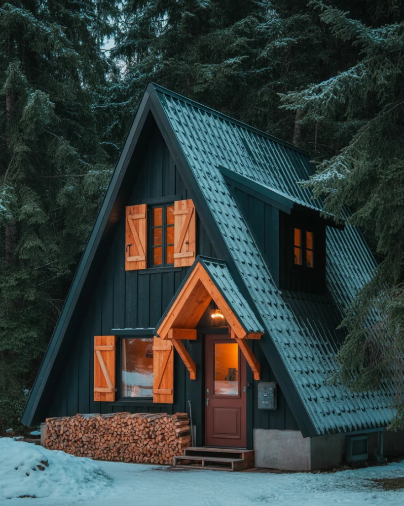 15. Black A-Frame Cabin with Wood Accents and Cedar Shutters