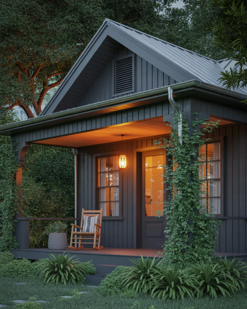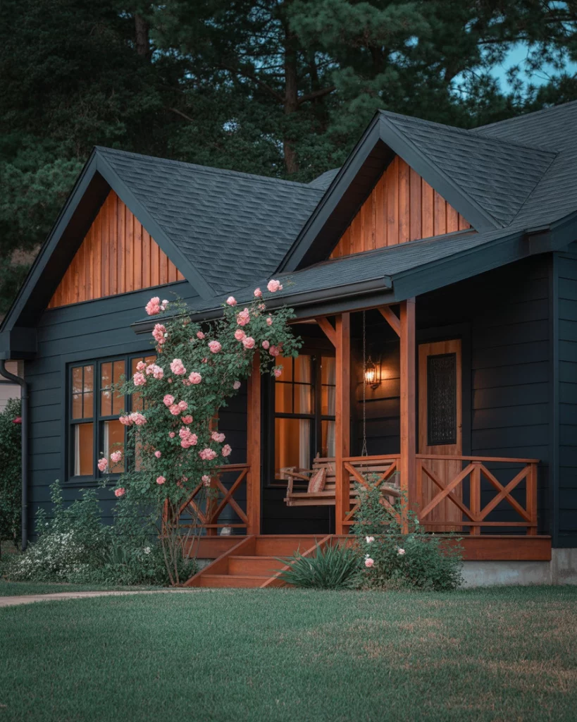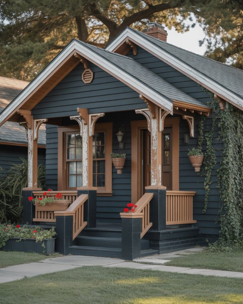 Bring back an old-time bungalow and paint it black and add wood accent features to the porch such as uncovered rafters and seating places. Add soft beige brown tones in shingles or fascia for warmth. This is really effective in historic areas of a mixture of old and new.