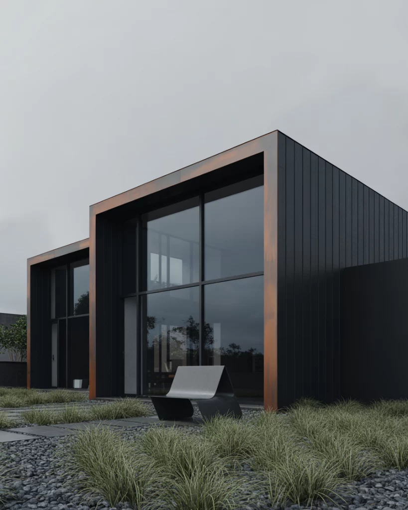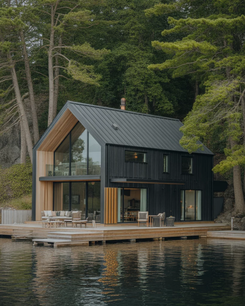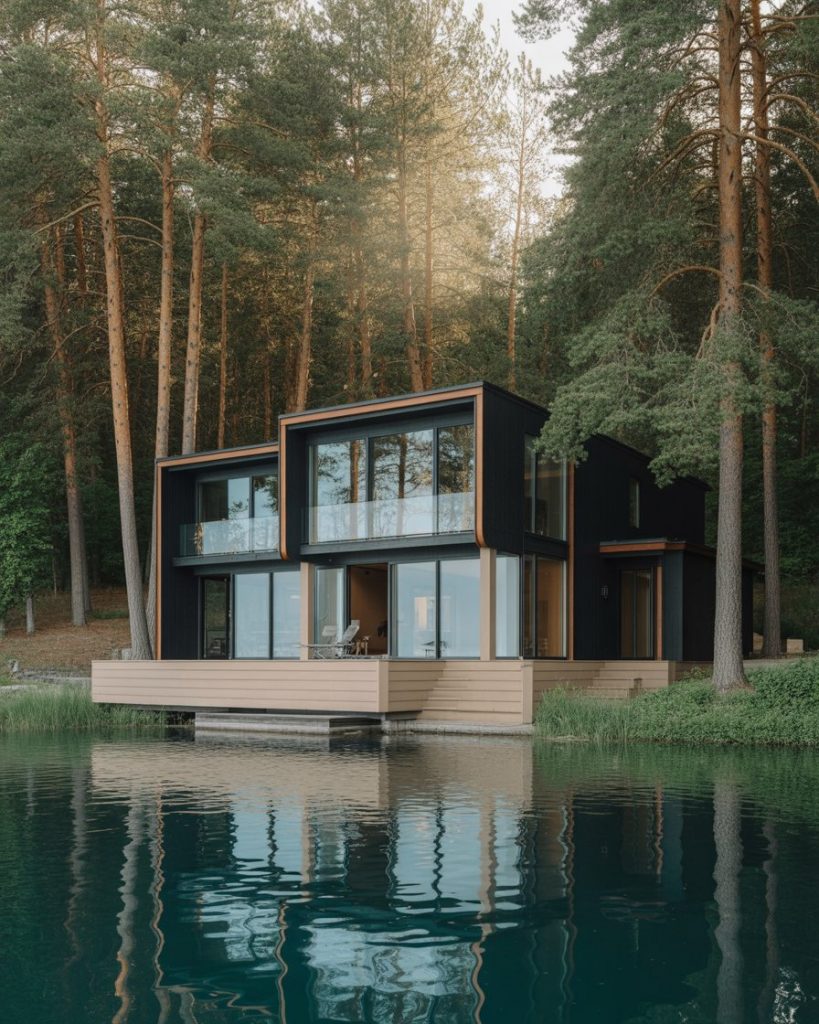 One of the black house fronts forms a peaceful contrast to blue glittering perspectives by water. Combine it with light tan decking, copper in the railings, and gentle outdoor lighting to do the magic at sunset. Stay low and geometric with the silhouette to be calm and stable.