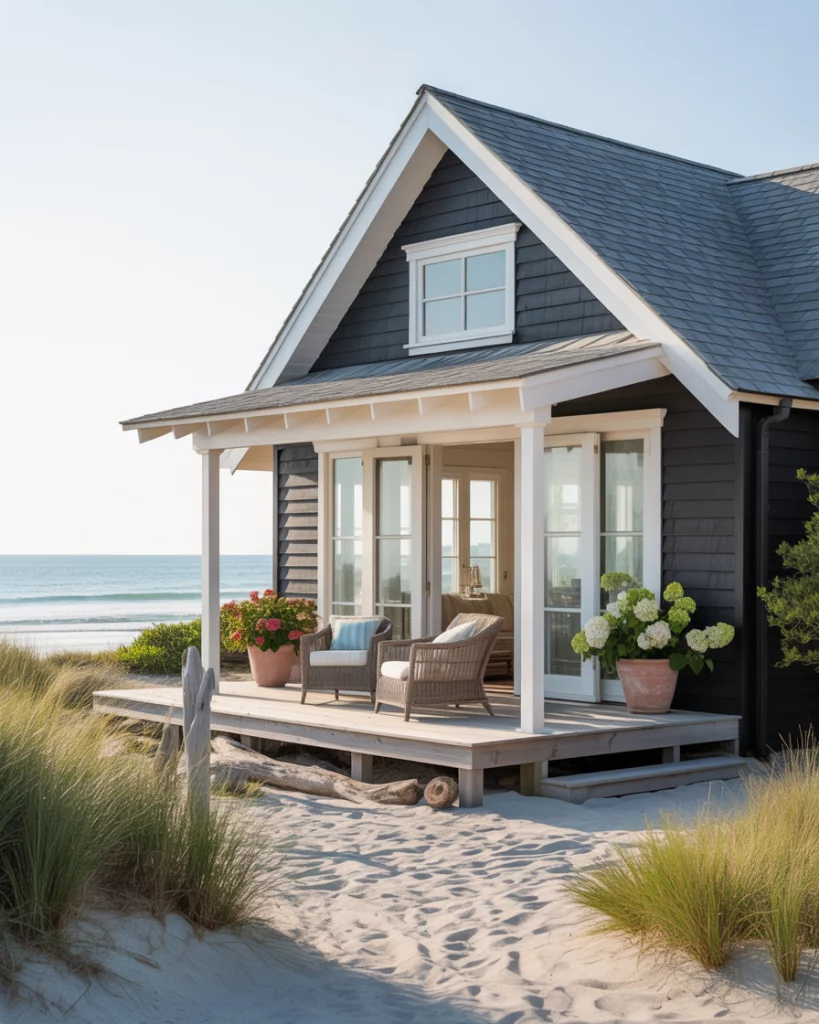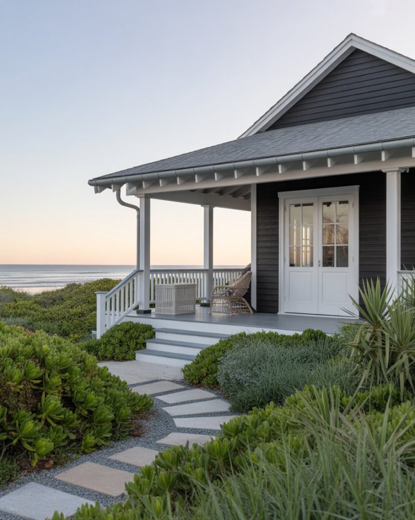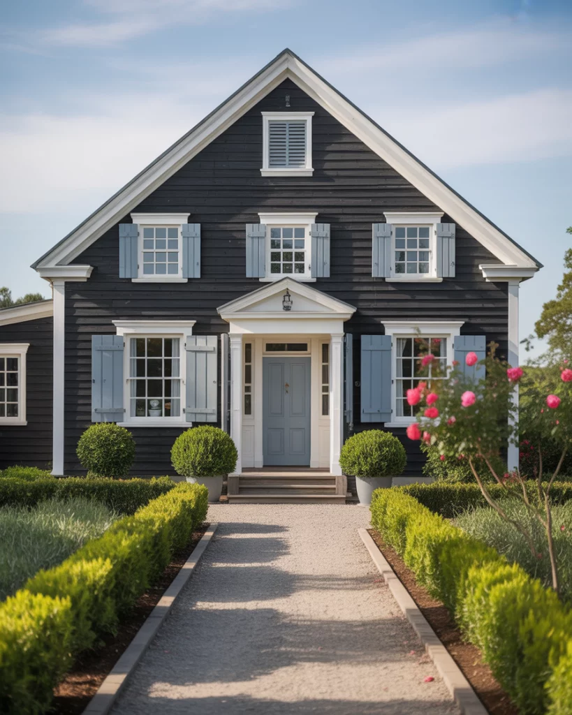 22. Coastal Black House with White Trim and Landscaping