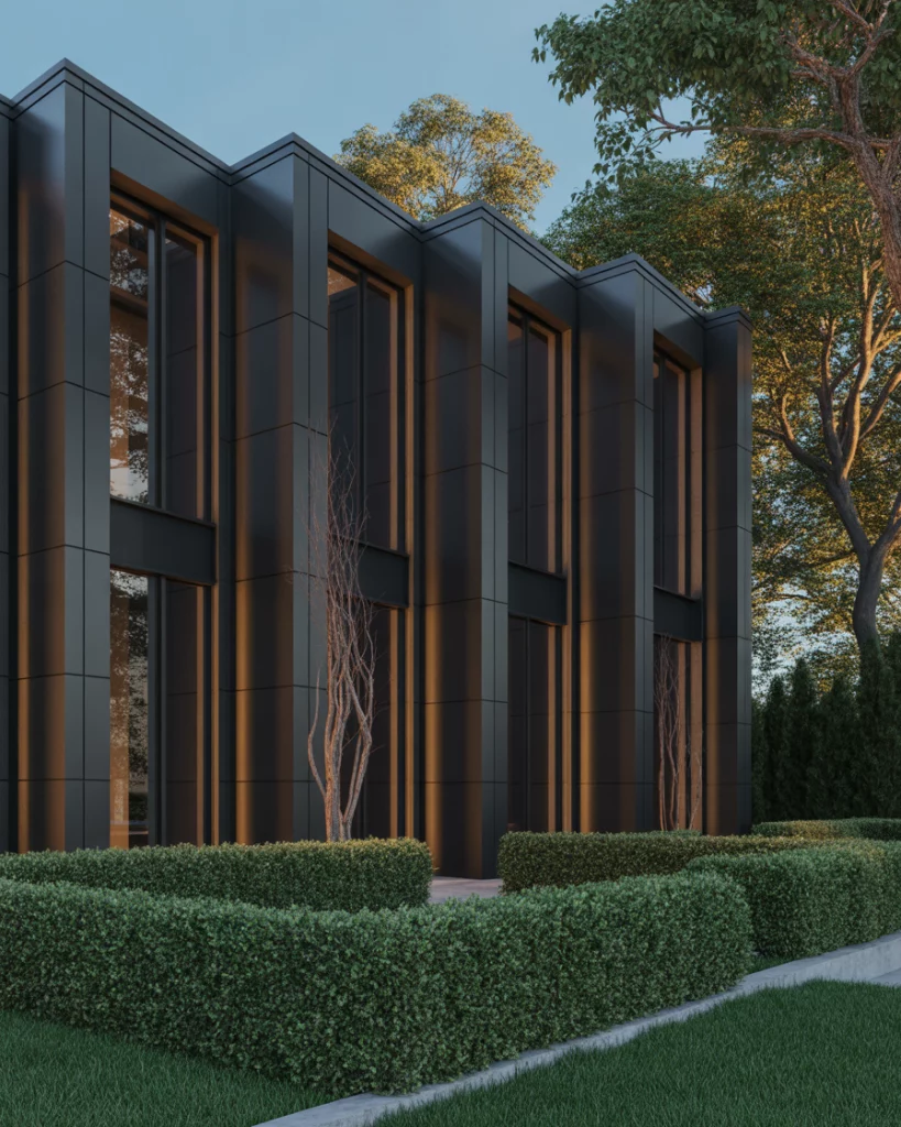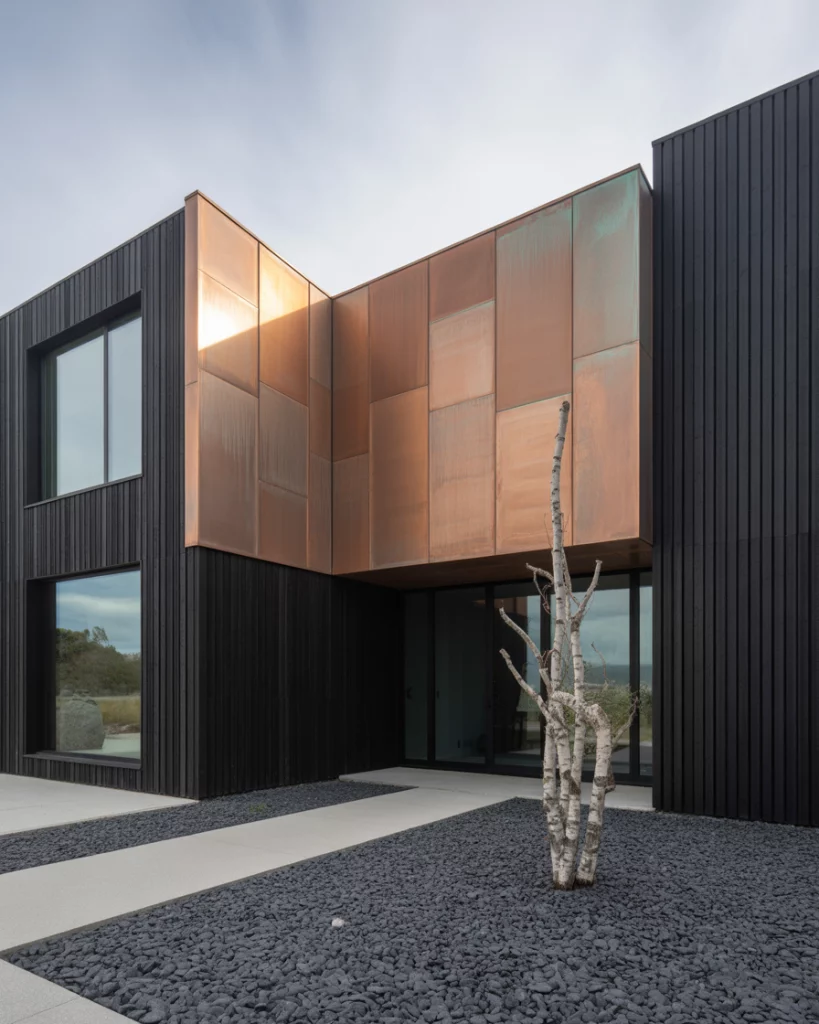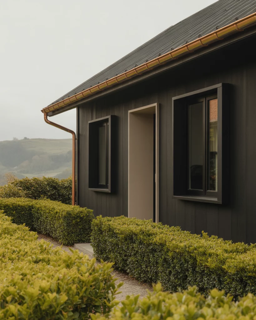 Copper accents, such as guttering, lights, or even address numbers can make a black exterior look like something really special. The patina of copper against a dark backdrop introduces contrast and movement. Such a combination fits perfectly with any urban loft-type house and industrial-type conversions.