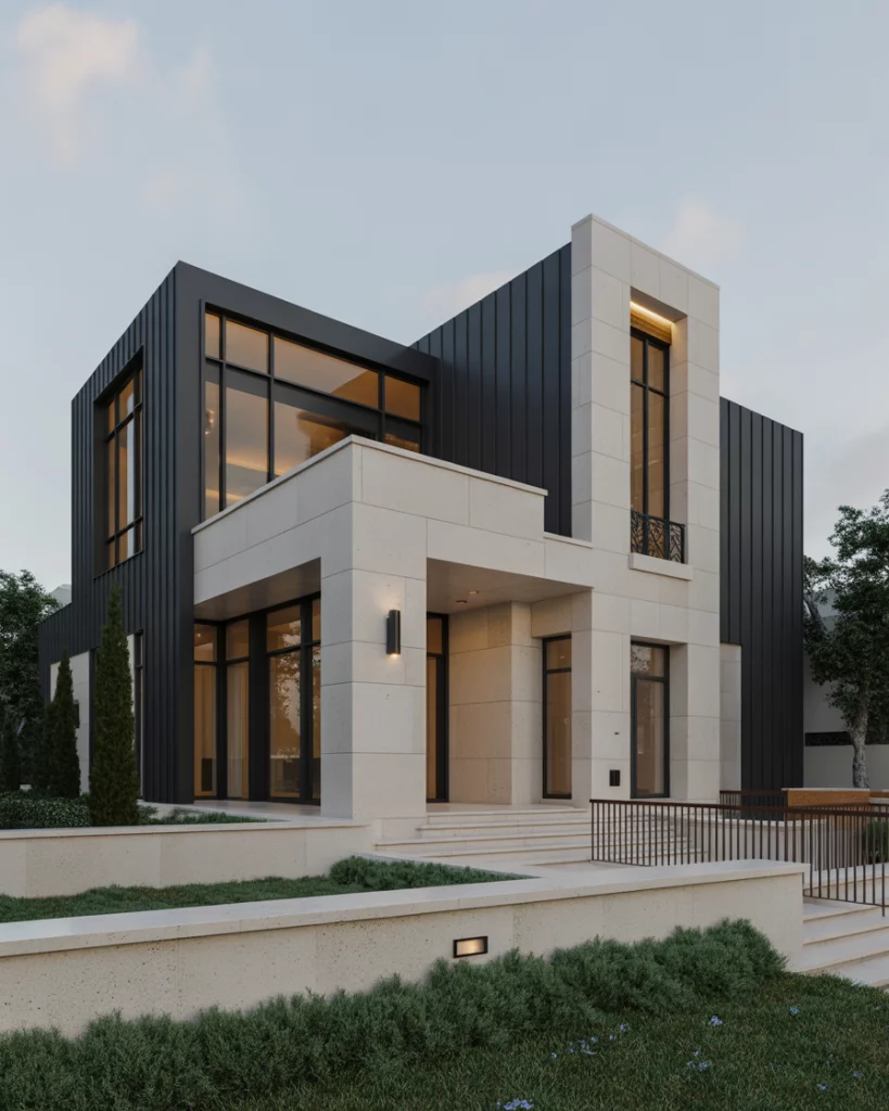 Finished in luxurious materials such as cream brown stone and special lighting are normally used to take black exteriors to higher levels in high-end homes. Think massive windows, dark iron railings, and soft limestone and columns. Well suited to custom constructions, or urban fill buildings, this style can pack on the richness without being gaudy.