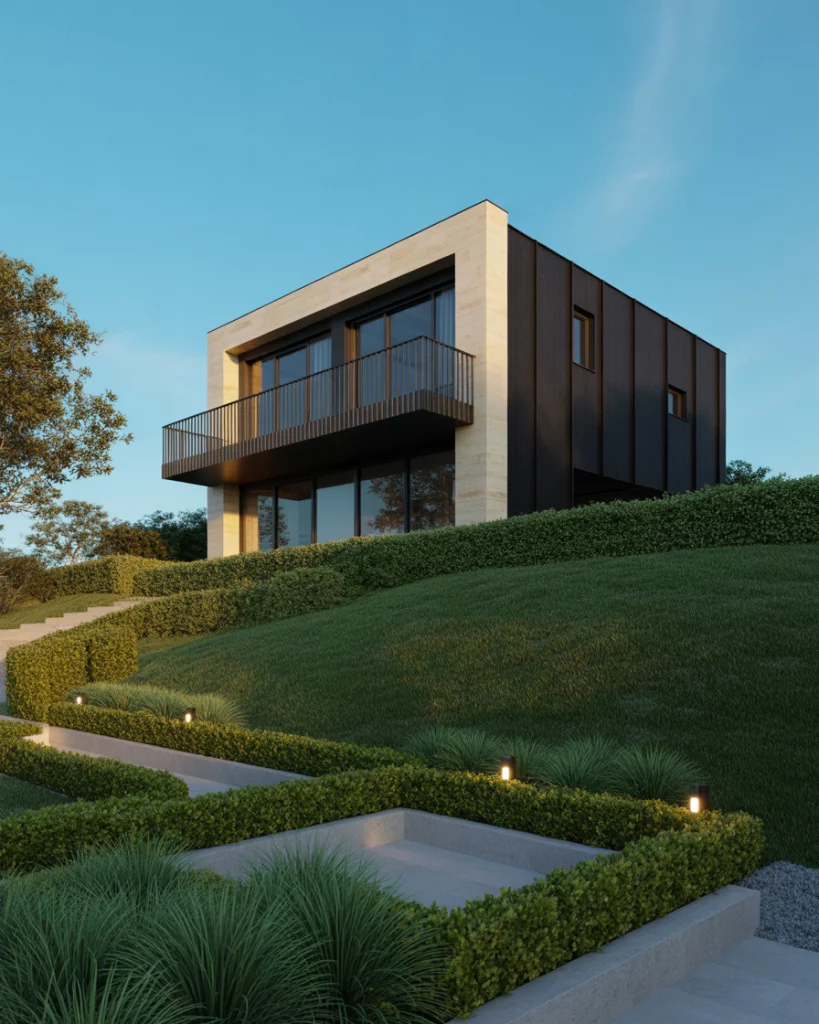 In need of polished curbside appearance, go all design modern with inbuilt copper lighting, square rooflines, and landscaped grounds. It is all about cohesion here, in terms of repetition in material, like vertical wood decoration, and polished paths. This concept is effective especially in new subdivisions where the modern houses are side by side.