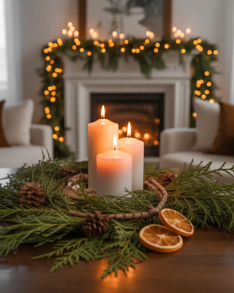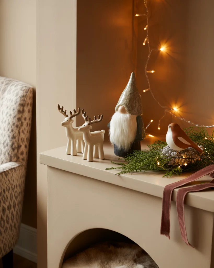 Rustic cabin is a theme that will never go out of fashion, and it is particularly comfortable in 2025. Plaid blankets, wooden reindeer, and pinecone wreaths will bring that mountain-lodge coziness to your home. This appearance perfectly suits the living room or one of the bedrooms, where comfort should be the main theme.