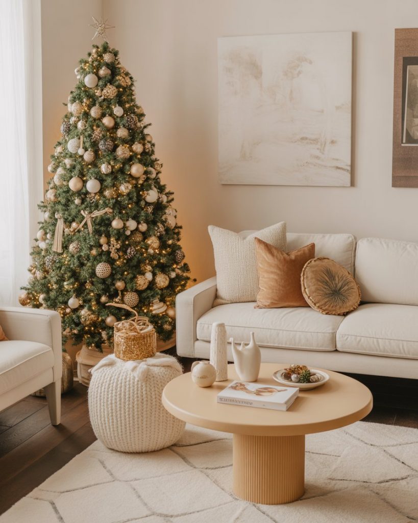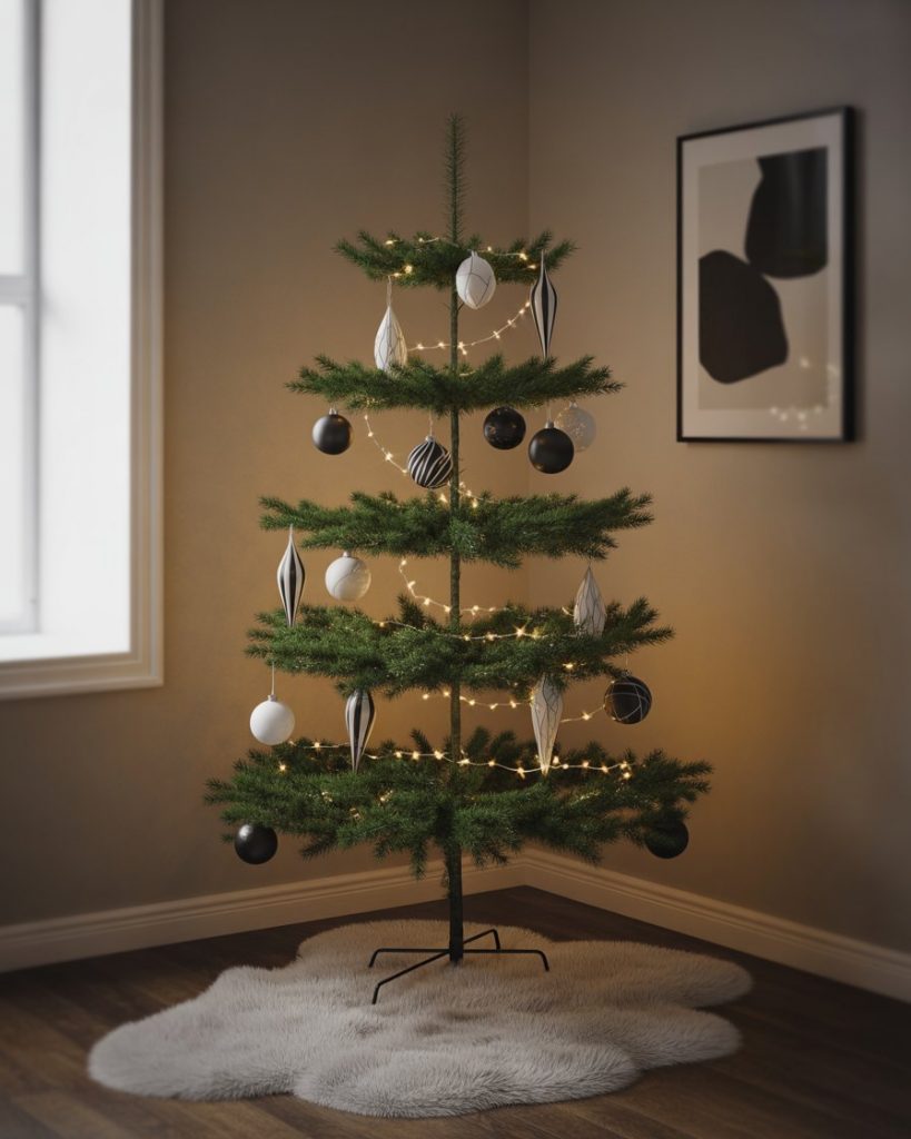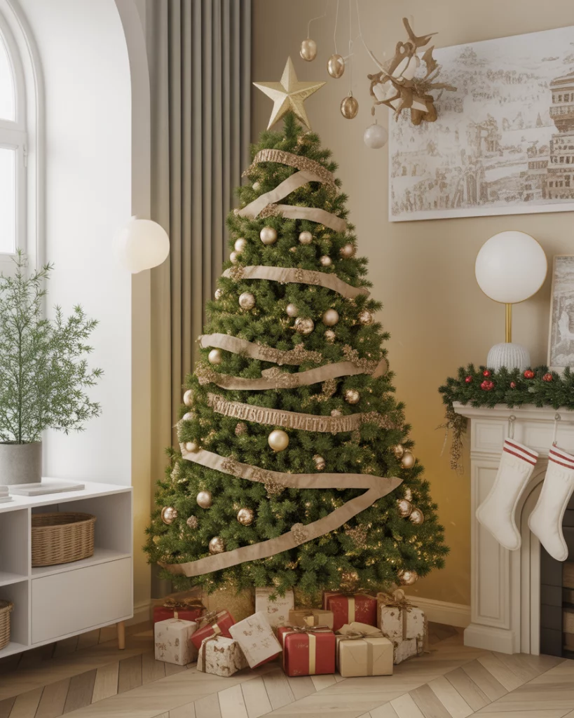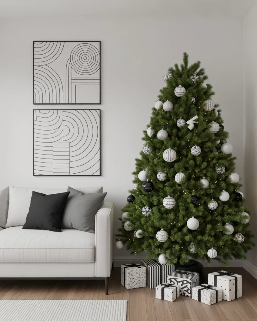To satisfy the luxury style, the black and gold color scheme is the most daring trend in 2025. This appearance works best in a living room, where dark decorations and metal ribbons will turn a tree into a fashion statement. The mood of the atmosphere is made modern with some touches of matte black and gilded candlesticks.
