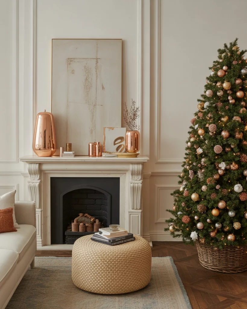 To achieve holiday glamour, go all the way and use metallics (gold, silver, copper) to bring luxury to any living room or bedroom. The shine of the tree lights is increased by metallic garlands, shiny baubles, and reflective trays.