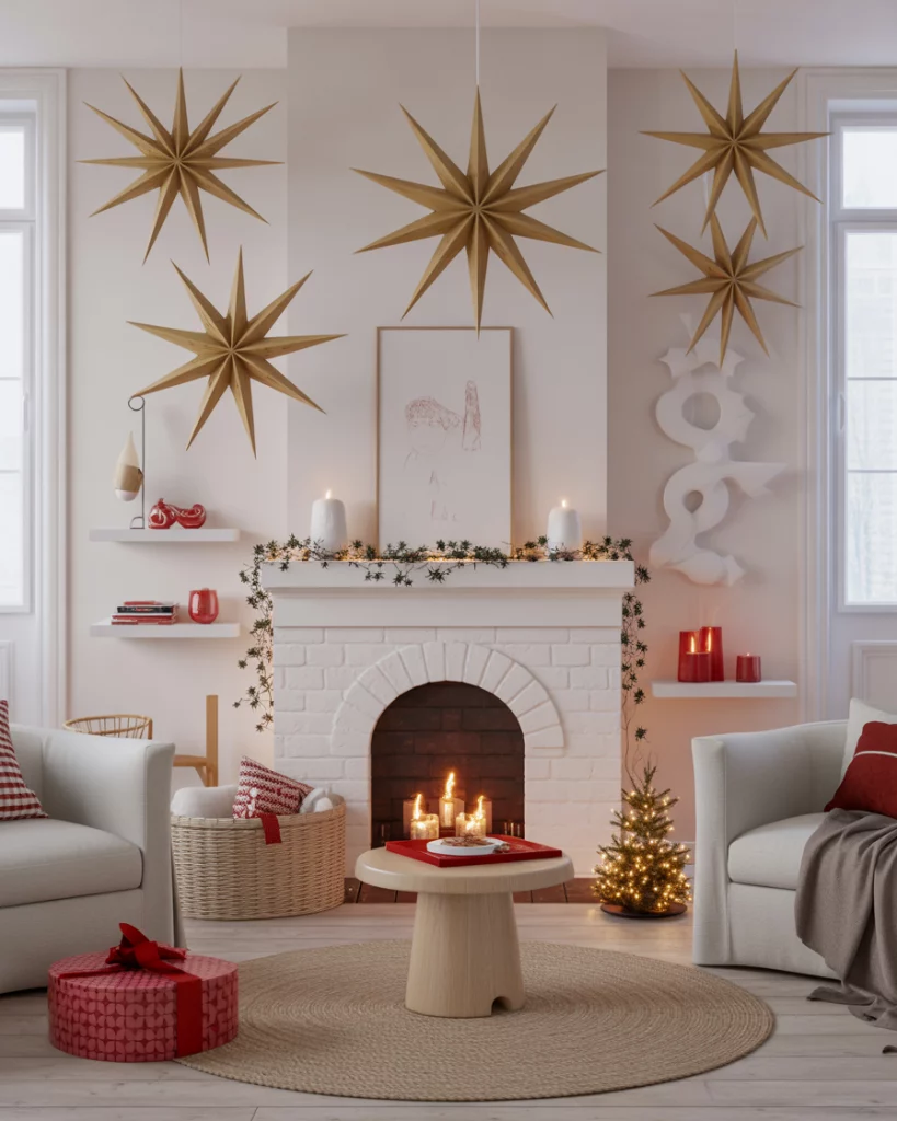 To be sleek and modern, a black and white holiday palette could be a good idea. Minimalistic stockings, geometrical decorations, and plain paper stars are used to provide a contrast in the interior spaces. It is practical in the living room where one does not require too much sophistication.
