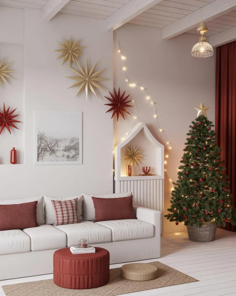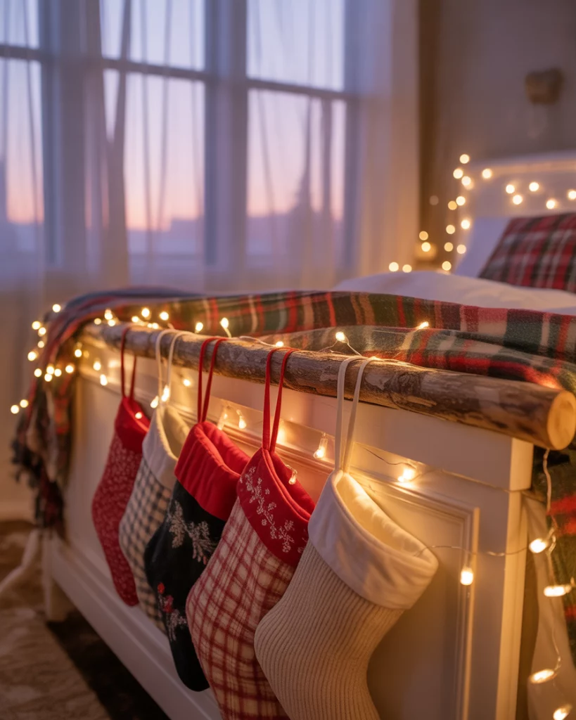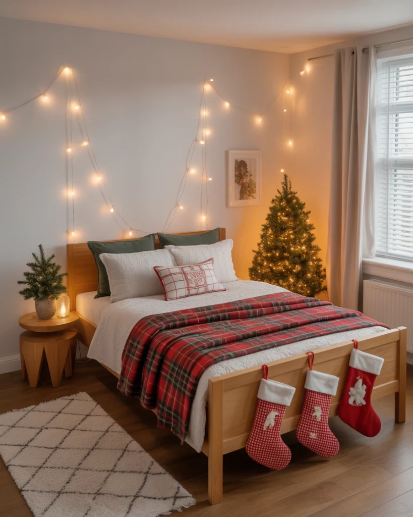 It is one of the most comfortable ideas of 2025 to transform your bedroom into a holiday sanctuary. Place white fairy lights over the headboard, plaid throws and homemade stockings at the end of the bed. This interior design creates a comfortable and relaxing atmosphere that is ideal after prolonged celebratory events.
