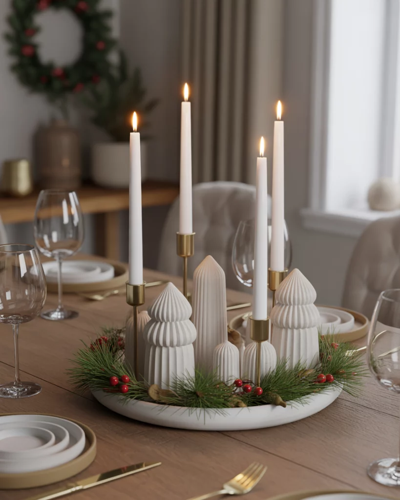 One of the ways to decorate dining tables in a sustainable and elegant manner is by using a clay centerpiece. These details add both texture and naturalness, whether it is handmade clay candleholders or rustic bowls with pine sprigs. They are particularly suitable in the home dining room, but also appear on dressers in the bedroom.
