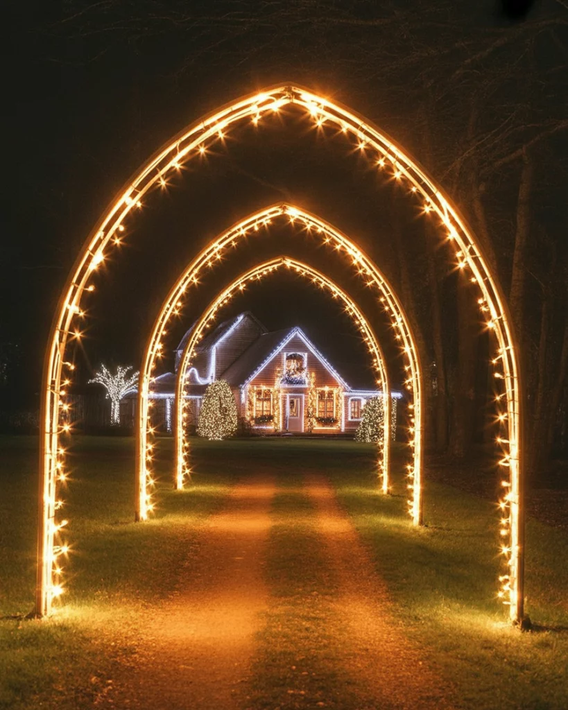 If you would like to impress guests, you could design a merry outdoor tunnel of string lights. Bulbs can be wrapped around arched PVC frames or wooden beams and create a glowing path to the house. This homemade outdoor concept is particularly effective in rural locations, where large lawns leave space to be creative. HGTV specialists usually showcase light tunnels as a highlight in the neighborhood with glowing arches and a warm rustic country house inside.