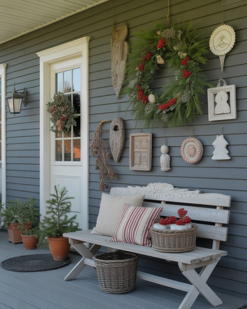 A rustic wreath wall on a fence or a porch makes your exterior a seasonal display. These wreaths are made using pine, berries or even clay ornaments to bring texture and variety. This is a cheap, but infinitely customizable, diy outdoor project that is perfect in the home with lots of wall or fence space.