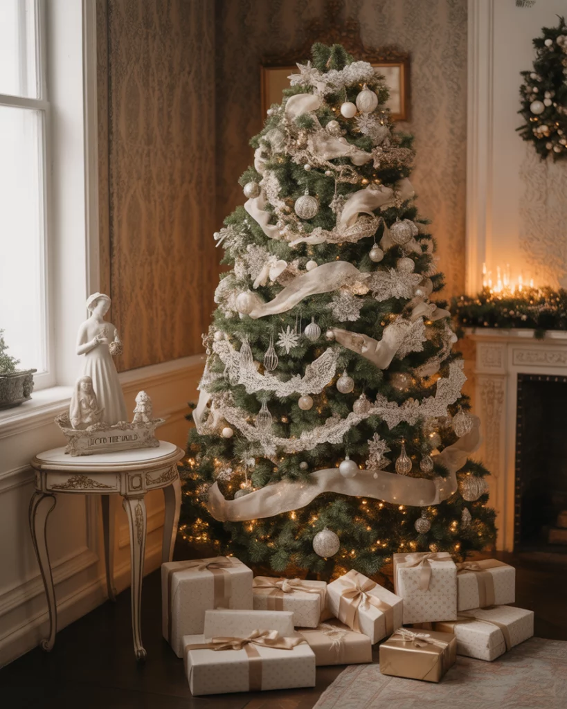 A Victorian-style design is candlelight and romantic. Imagine brass holders, stockings with lace, and glass baubles that shone in the soft fires. This appearance is best suited to an interior, particularly a bedroom or a parlor.