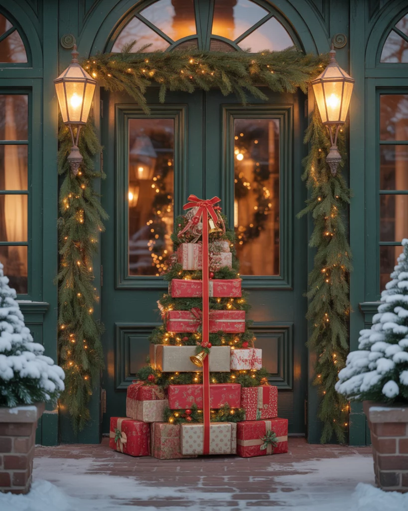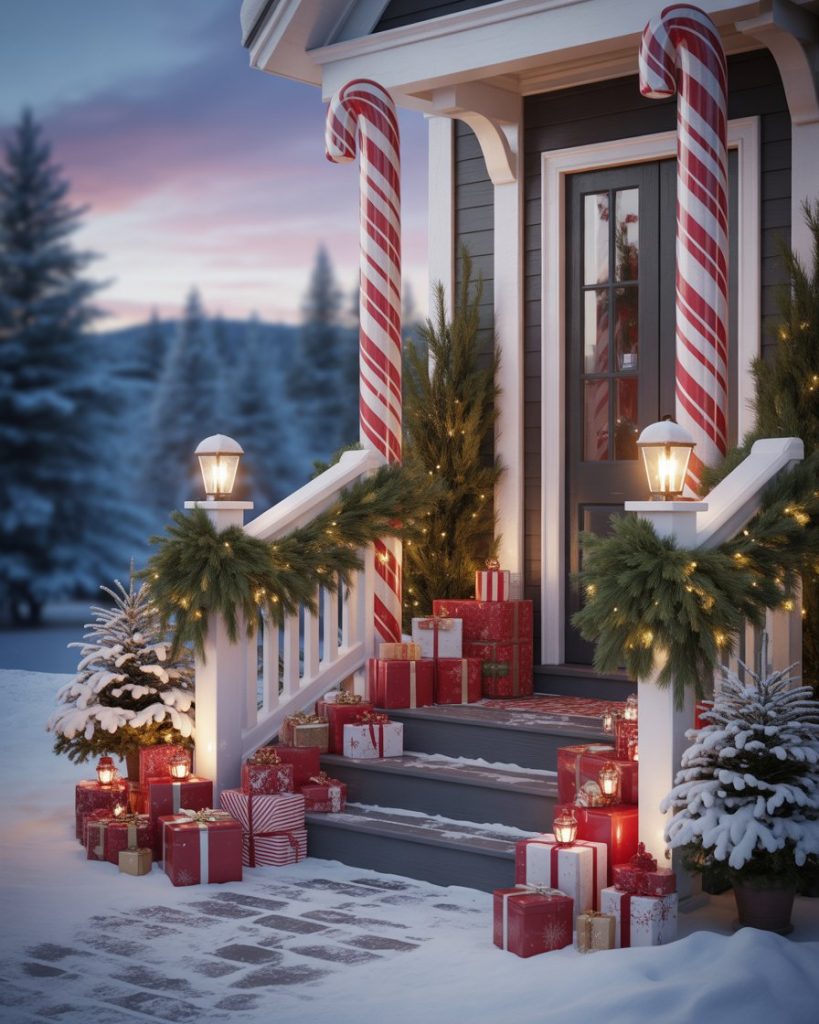Transform your front entry porch into a dreamy North Pole-inspired setting using giant candy cane pillars, stacked snowy gifts, snow-dusted evergreen garlands, and soft glowing lanterns. Include arctic-style props like sleigh runners and faux ice crystals to evoke the chill of the far north. This easy idea creates a whimsical holiday welcome and is perfect for home, Christian, or outdoor décor without any signage or characters—just pure, magical ambiance.