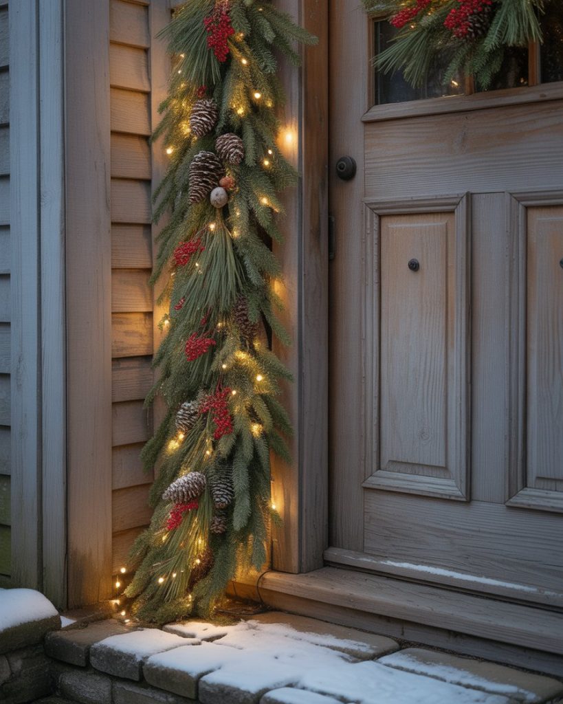 Instead of wrapping the door like a gift, dress it with classic evergreen touches that feel festive yet elegant. Drape lush pine garlands around the frame, accent them with pinecones, red berries, and subtle fairy lights. Add small hanging ornaments or frosted branches to create depth, but keep the door itself simple and unwrapped to let the greenery shine. This easy, diy style is ideal for school, Christian, or work spaces that favor natural beauty over bold gimmicks.