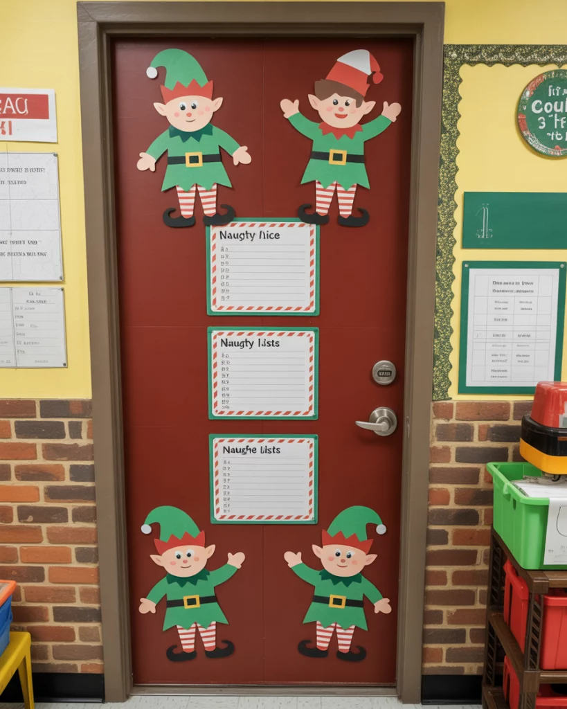 Turn your door into an Elf Surveillance HQ, complete with toy cams, naughty/nice lists, and cheeky elf peeking out. It’s a hilarious contest idea that works especially well in a classroom or preschool setting. Add a clipboard or rotating list with real students’ names for a fun interactive twist.