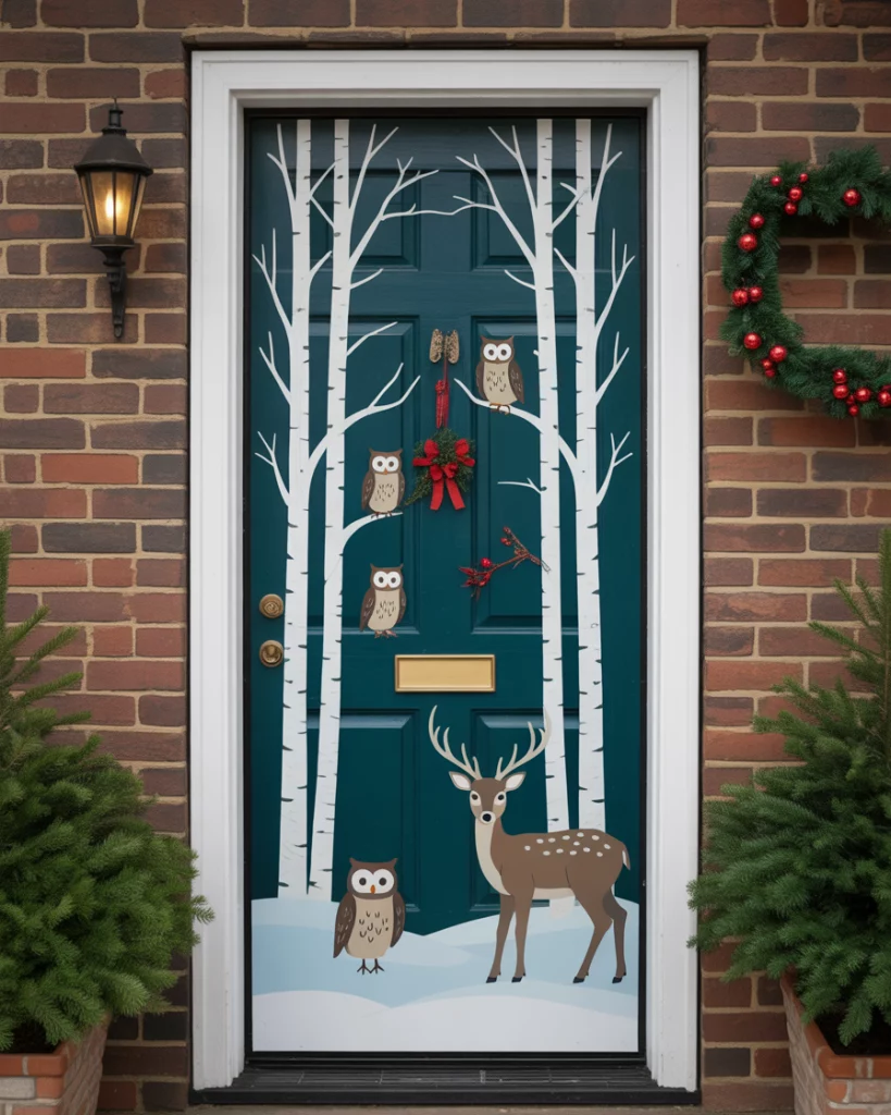 Go nature-inspired with owls, foxes, and deer against a snowy birch tree backdrop. Use soft felt, cotton for snow, and muted tones for a wintry, elegant look. This is ideal for school, Christian for work, or even outdoor doors that need to blend with nature. It’s calming, beautiful, and unique.