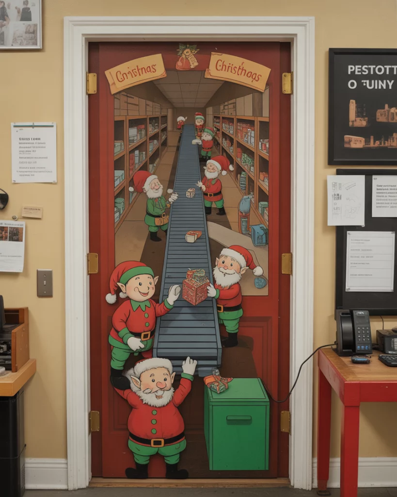 Make your door look like Santa’s Toy Workshop in full production mode! Add elves working, toys on conveyor belts, and signs like “Assembly in Progress.” A brilliant contest funny option, especially for work environments with a playful vibe.