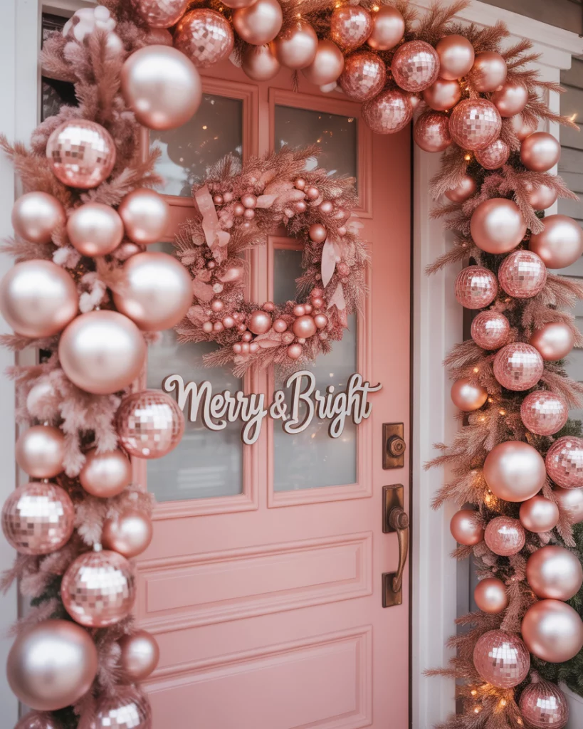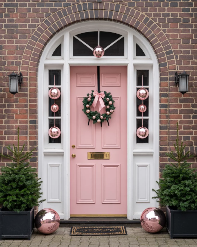 Yes, pink is the new red this year. A Christmas door dripping in blush tones, rose-gold ribbons, and frosted wreaths is bold, chic, and undeniably trendy. Perfect for an office contest, it says you’re playful but fashion-forward. Add disco balls or pink flamingos wearing Santa hats for a contest funny spin that’ll turn heads.