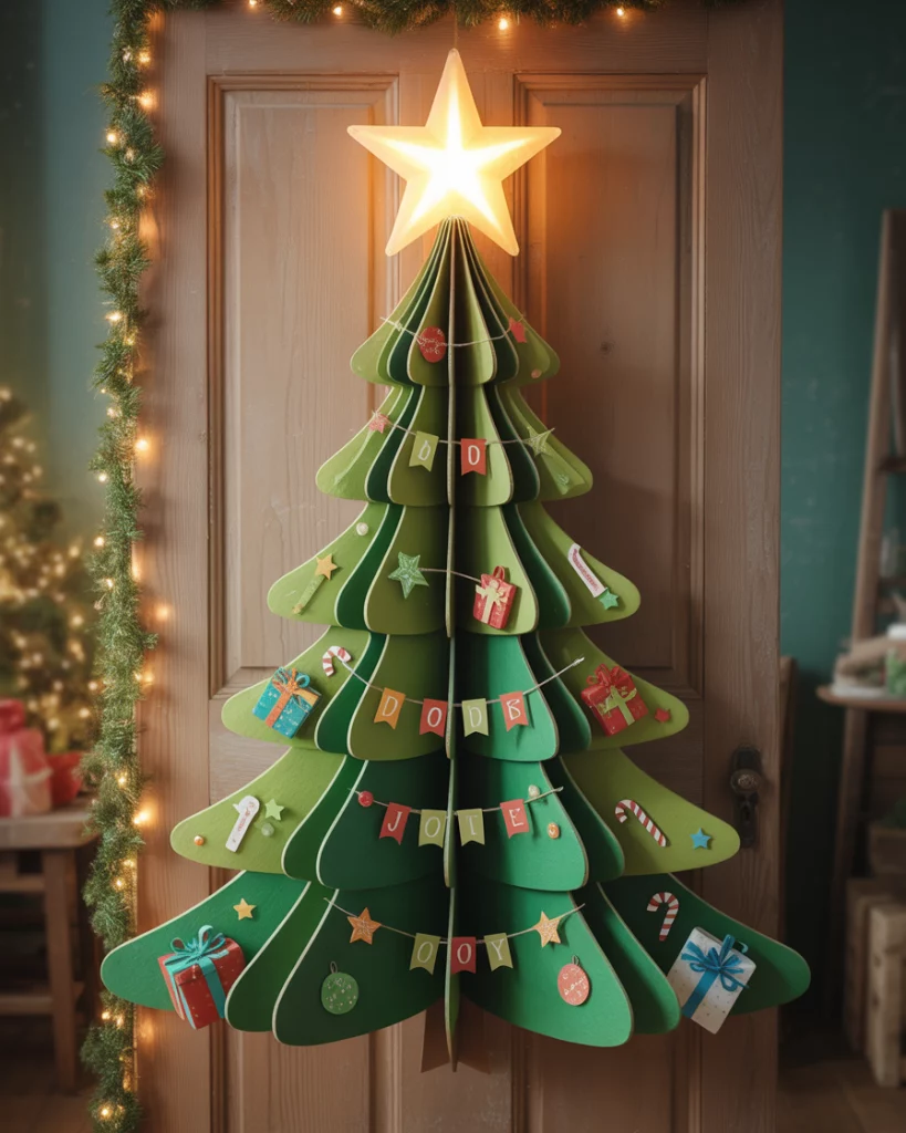 Create a 3D tree that “pops out” from your door using foam core, ribbons, and mini ornaments. Add presents under the tree and a glowing star on top. This diy project is easy, yet has big visual impact—great for school, contest, or Christian home décor alike.