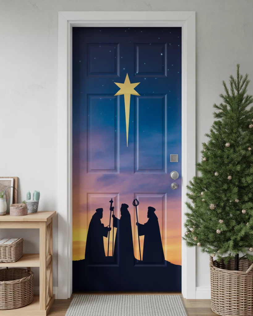 Turn your door into the night sky over Bethlehem, with the Star of David guiding the way. Use dark navy backgrounds, shining stars, and silhouettes of the three wise men. Ideal for Christian for school, Christian for home, or Christian for work settings, this design adds solemn beauty with a spiritual message.