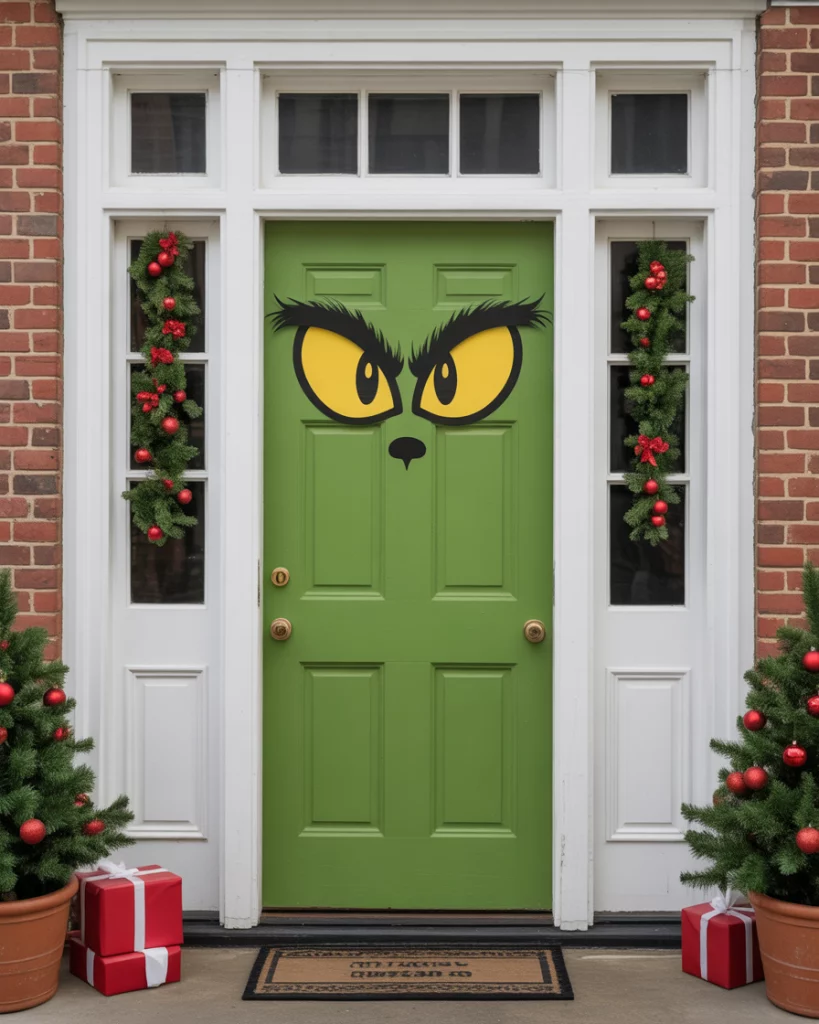 Whether you’re keeping out the Grinch—or inviting him in with flair—this idea never fails. Use vibrant green streamers, fur trim, and oversized yellow eyes to craft a contest grinch look that’s both funny and surprisingly easy. Great for school competitions or family neighborhoods where humor reigns.