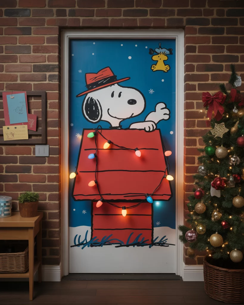 Bring Snoopy and the Peanuts gang to your door with blinking lights, Snoopy’s doghouse, and maybe Woodstock in a Santa hat. This nostalgic pick is a hit in school preschool settings and works wonderfully in classroom door contest ideas. It’s festive, familiar, and loved by both kids and grownups.
